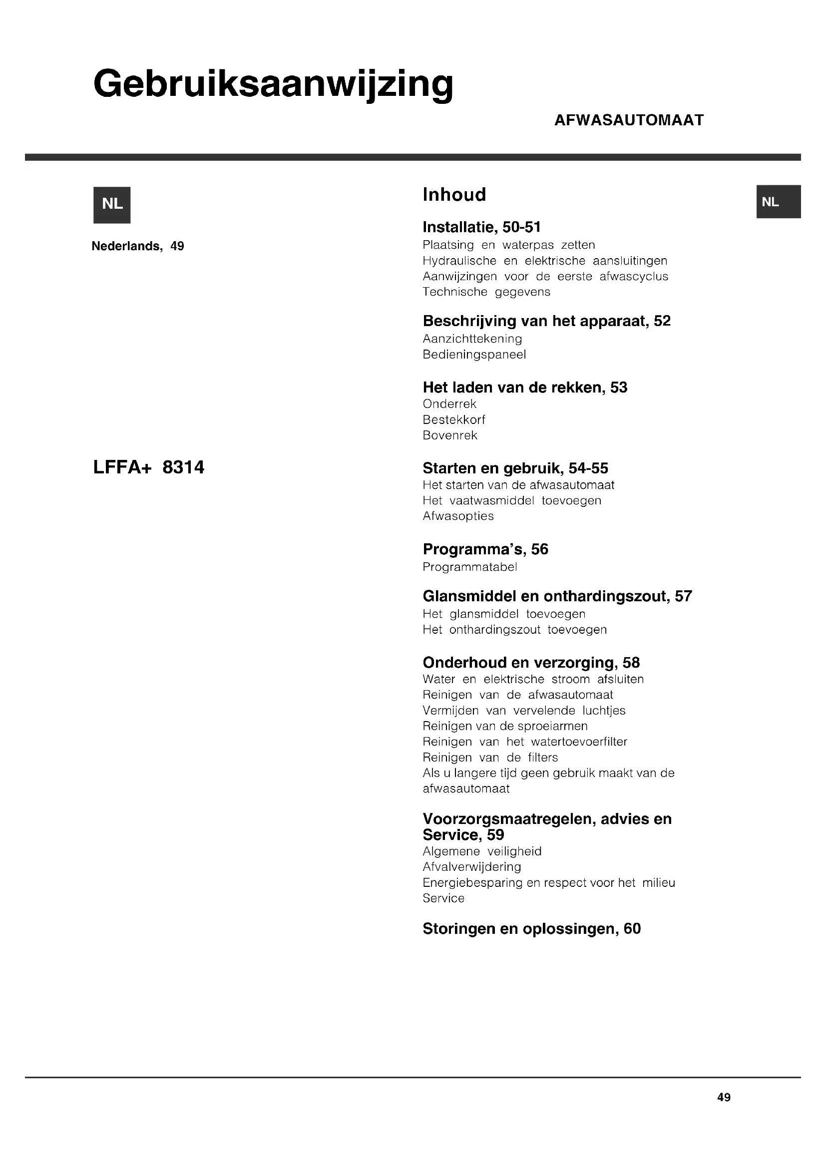 Gebruiksaanwijzing Inhoud Installatie, 50-51 Plaatsing en waterpas zetten Hydraulische en elektrische aansluitingen Aanwijzingen voor de eerste afwascyclus Technische gegevens Beschrijving van het apparaat, 52 Aanzichttekening Bedieningspaneel Het laden van de rekken, 53 Onderrek Bestekkorf Bovenrek Starten en gebruik, 54-55 Het starten van de afwasautomaat Het vaatwasmiddel toevoegen Afwasopties Programmas, 56 Programmatabel Glansmiddel en onthardingszout, 57 Het glansmiddel toevoegen Het onthardingszout toevoegen Onderhoud en verzorging, 58 Water en elektrische stroom afsluiten Reinigen van de afwasautomaat Vermijden van vervelende luchtjes Reinigen van de sproeiarmen Reinigen van het watertoevoerfilter Reinigen van de filters Als u langere tijd geen gebruik maakt van de afwasautomaat Voorzorgsmaatregelen, advies en Service, 59 Algemene veiligheid Afvalverwijdering Energiebesparing en respect voor het milieu Service Storingen en oplossingen, 60 Nederlands, 49
