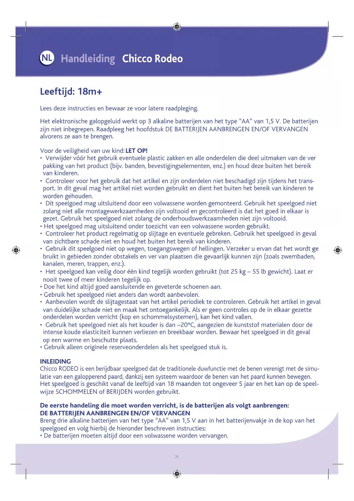 - Gebruik alleen originele reserveonderdelen als het speelgoed stuk is. INLEIDING Chicco RODEO is een berijdbaar speelgoed dat de traditionele duwfunctie met de benen verenigt met de simu- latie van een galopperend paard, dankzij een systeem waardoor de benen van het paard kunnen bewegen. Het speelgoed is geschikt vanaf de leeftijd van 18 maanden tot ongeveer 5 jaar en het kan op de speel- wijze SCHOMMELEN of BERIJDEN worden gebruikt. De eerste handeling die moet worden verricht, is de batterijen als volgt aanbrengen: