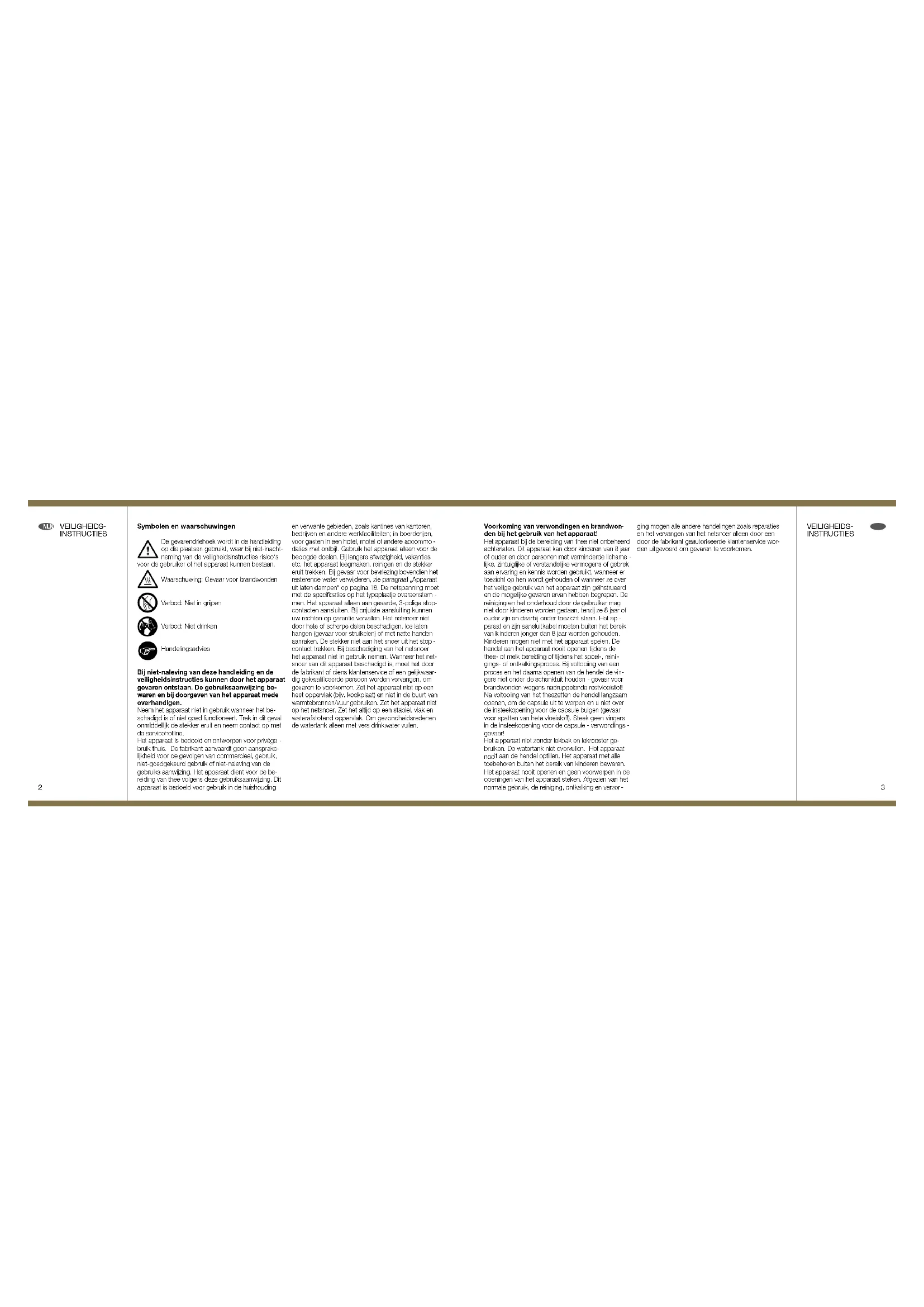 220–240 V~, 50 Hz, max. 1455 W 1 m max. 19 bar ca. 1 l cca 3.8 kg A = 150 mm B = 398 mm C = 297 mm 10 °C – 45 °C ~ 90° C max. 150 mm CZ NL2 3 Symbolen en waarschuwingen De gevarendriehoek wordt in de handleiding op die plaatsen gebruikt, waar bij niet-inacht- neming van de veiligheidsinstructies risico‘s voo r de gebruiker of het apparaat kunnen bestaan. Waarschuwing: Gevaar voor brandwonden Verbod: Niet in grijpen Verbod: Niet drinken Handelingsadvies Bij niet-naleving van deze handleiding en de veiligheidsinstructies kunnen door het apparaat gevaren ontstaan. De gebruiksaanwijzing be- waren en bij doorgeven van het apparaat mede over handigen. Neem het apparaat niet in gebruik wanneer het be- schadigd is of niet goed functioneert. Trek in dit geval