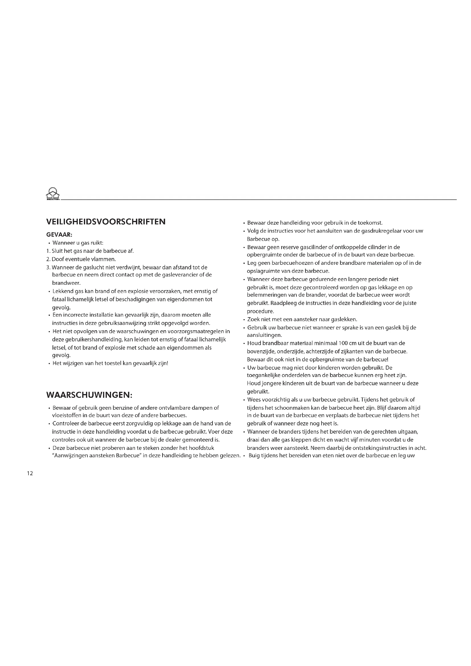 - Deze barbecue niet proberen aan te steken zonder het hoofdstuk “Aanwijzingen aansteken Barbecue” in deze handleiding te hebben gelezen.