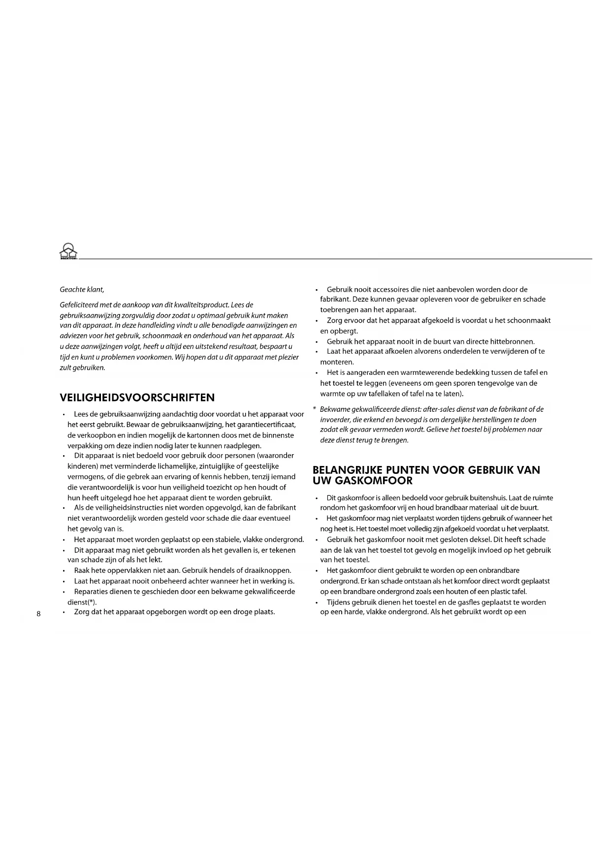 - Bekwame gekwaliceerde dienst: after-sales dienst van de fabrikant of de invoerder, die erkend en bevoegd is om dergelijke herstellingen te doen zodat elk gevaar vermeden wordt. Gelieve het toestel bij problemen naar deze dienst terug te brengen. belanGrijke punten voor Gebruik van uW Gaskomfoor