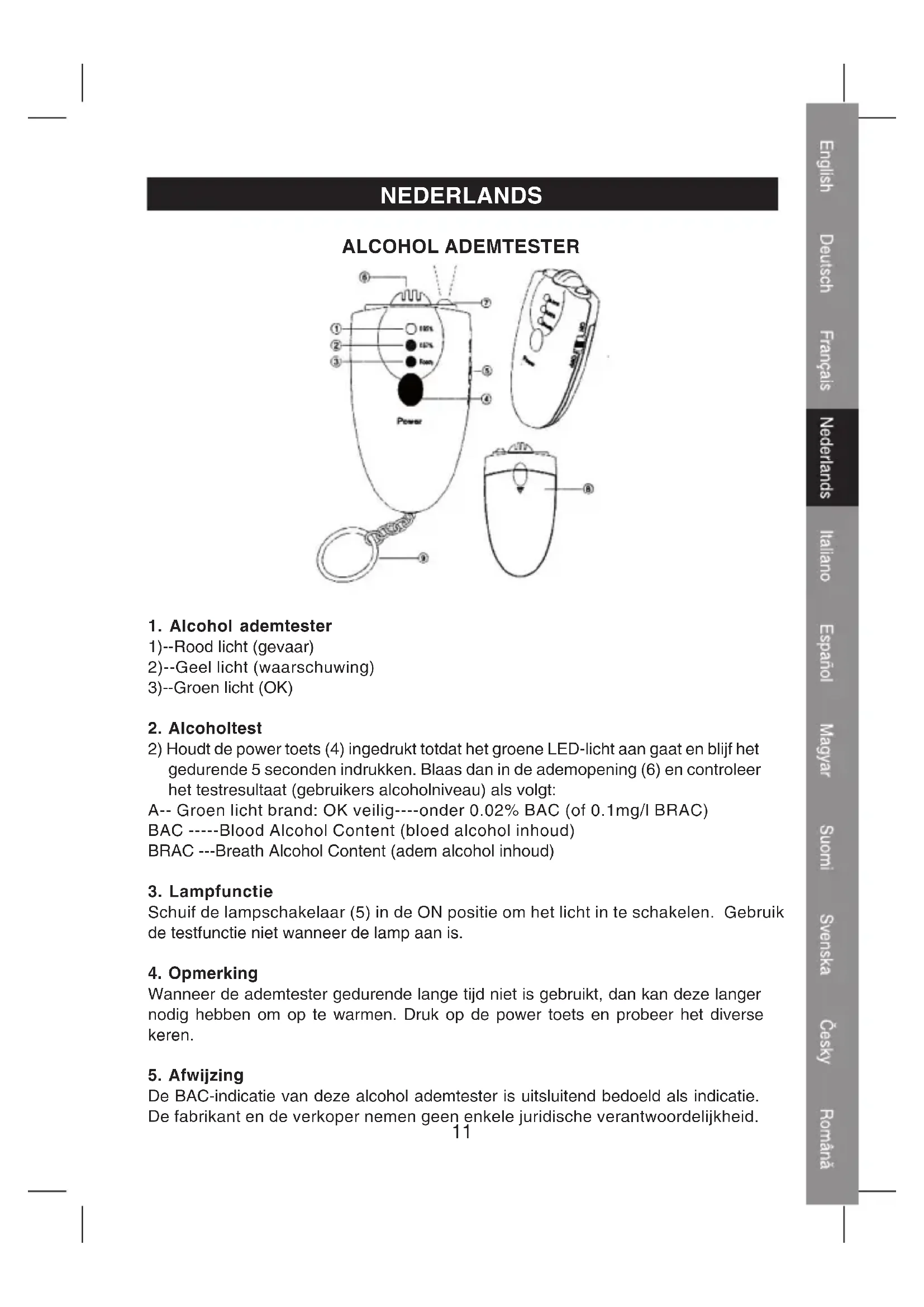 gedurende 5 seconden indrukken. Blaas dan in de ademopening (6) en controleer het testresultaat (gebruikers alcoholniveau) als volgt: A-- Groen licht brand: OK veilig----onder 0.02% BAC (of 0.1mg/l BRAC) BAC -----Blood Alcohol Content (bloed alcohol inhoud) BRAC ---Breath Alcohol Content (adem alcohol inhoud)