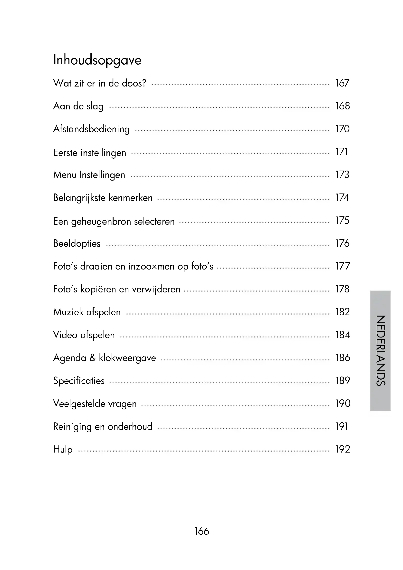 Inhoudsopgave Wat zit er in de doos? Aan de slag Afstandsbediening Eerste instellingen Menu Instellingen Belangrijkste kenmerken Een geheugenbron selecteren Beeldopties Foto’s draaien en inzoo×men op foto’s Foto’s kopiëren en verwijderen Muziek afspelen Video afspelen Agenda & klokweergave Specificaties Veelgestelde vragen Reiniging en onderhoud Hulp
