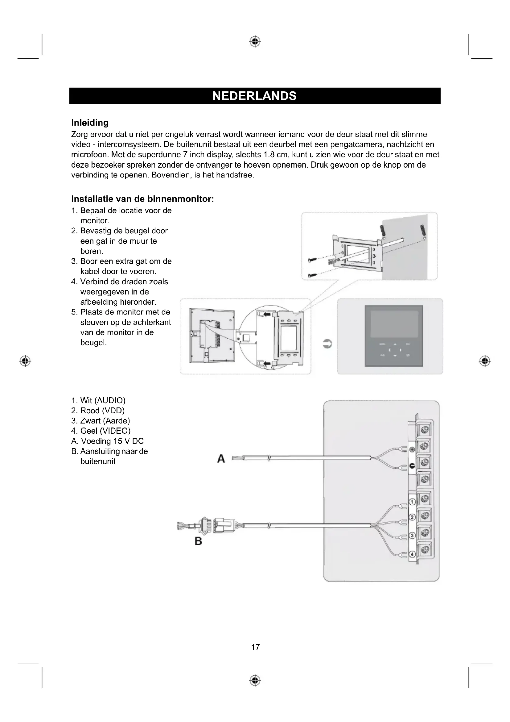 A. Voeding 15 V DC B. Aansluiting naar de buitenunit18 Installatie van de buitenunit: