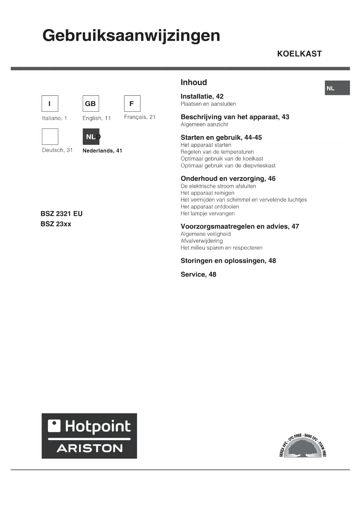 01/2014NL KOELKAST Inhoud Installatie, 42 Plaatsen en aansluiten Beschrijving van het apparaat, 43 Algemeen aanzicht Starten en gebruik, 44-45 Het apparaat starten Regelen van de temperaturen Optimaal gebruik van de koelkast Optimaal gebruik van de diepvrieskast Onderhoud en verzorging, 46 De elektrische stroom afsluiten Het apparaat reinigen Het vermijden van schimmel en vervelende luchtjes Het apparaat ontdooien Het lampje vervangen Voorzorgsmaatregelen en advies, 47 Algemene veiligheid Afvalverwijdering Het milieu sparen en respecteren Storingen en oplossingen, 48 Service, 48 Gebruiksaanwijzingen Italiano, 1