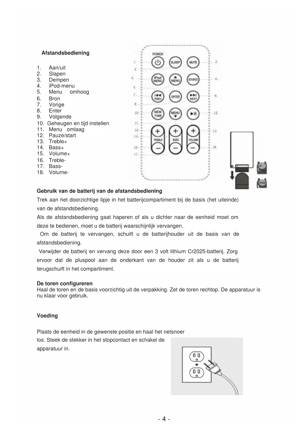 Gebruik van de batterij van de afstandsbediening Trek aan het doorzichtige lipje in het batterijcompartiment bij de basis (het uiteinde) van de afstandsbediening. Als de afstandsbediening gaat haperen of als u dichter naar de eenheid moet om deze te bedienen, moet u de batterij waarschijnlijk vervangen. Om de batterij te vervangen, schuift u de batterijhouder uit de basis van de afstandsbediening. Verwijder de batterij en vervang deze door een 3 volt lithium Cr2025-batterij. Zorg ervoor dat de pluspool aan de onderkant van de houder zit als u de batterij terugschuift in het compartiment. De toren configureren Haal de toren en de basis voorzichtig uit de verpakking. Zet de toren rechtop. De apparatuur is nu klaar voor gebruik. Voeding Plaats de eenheid in de gewenste positie en haal het netsnoer los. Steek de stekker in het stopcontact en schakel de apparatuur in.