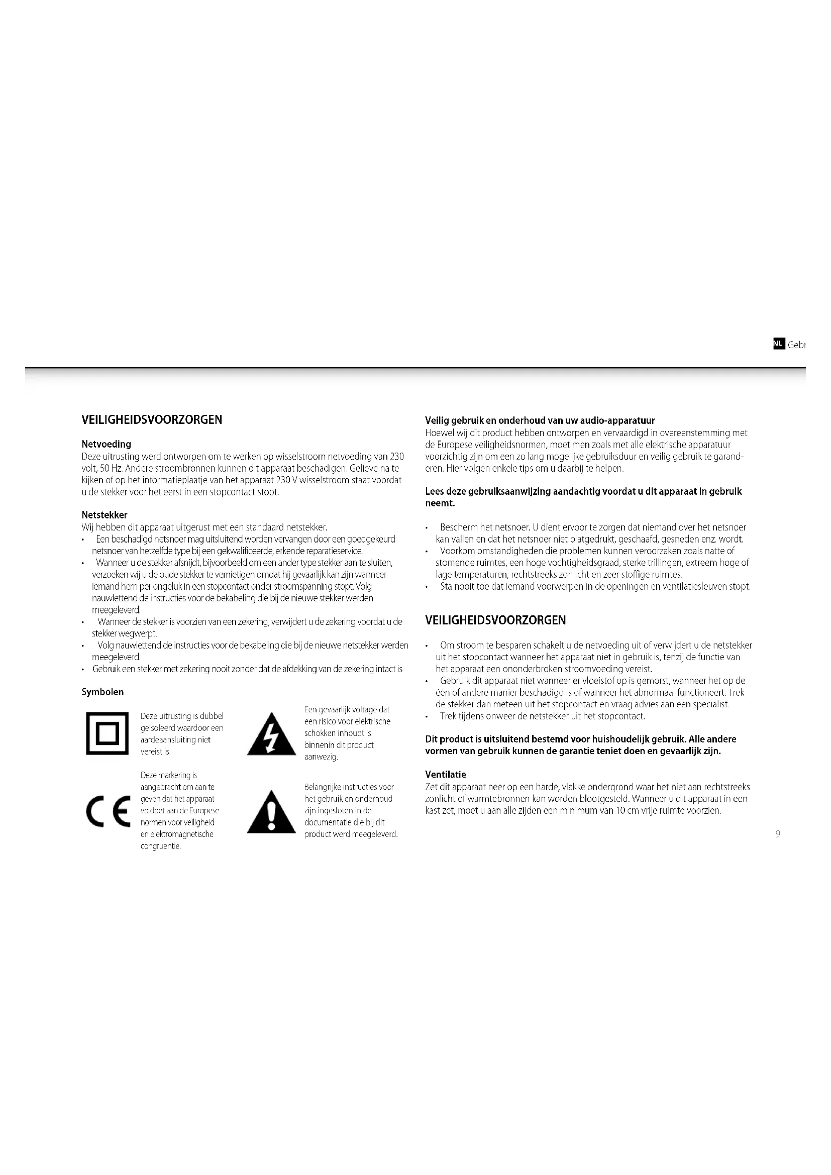 - Gebruik een stekker met zekering nooit zonder dat de afdekking van de zekering intact is Symbolen Deze uitrusting is dubbel geïsoleerd waardoor een aardeaansluiting niet vereist is. Een gevaarlijk voltage dat een risico voor elektrische schokken inhoudt is binnenin dit product aanwezig. Deze markering is aangebracht om aan te geven dat het apparaat voldoet aan de Europese normen voor veiligheid en elektromagnetische congruentie. Belangrijke instructies voor het gebruik en onderhoud zijn ingesloten in de documentatie die bij dit product werd meegeleverd. Veilig gebruik en onderhoud van uw audio-apparatuur Hoewel wij dit product hebben ontworpen en vervaardigd in overeenstemming met de Europese veiligheidsnormen, moet men zoals met alle elektrische apparatuur voorzichtig zijn om een zo lang mogelijke gebruiksduur en veilig gebruik te garand- eren. Hier volgen enkele tips om u daarbij te helpen. Lees deze gebruiksaanwijzing aandachtig voordat u dit apparaat in gebruik neemt.