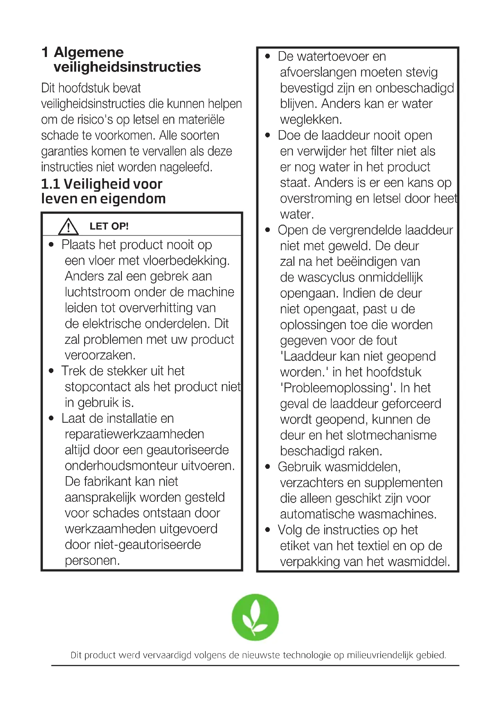 - Volg de instructies op het etiket van het textiel en op de verpakking van het wasmiddel. Dit hoofdstuk bevat veiligheidsinstructies die kunnen helpen om de risico's op letsel en materiële schade te voorkomen. Alle soorten garanties komen te vervallen als deze instructies niet worden nageleefd.