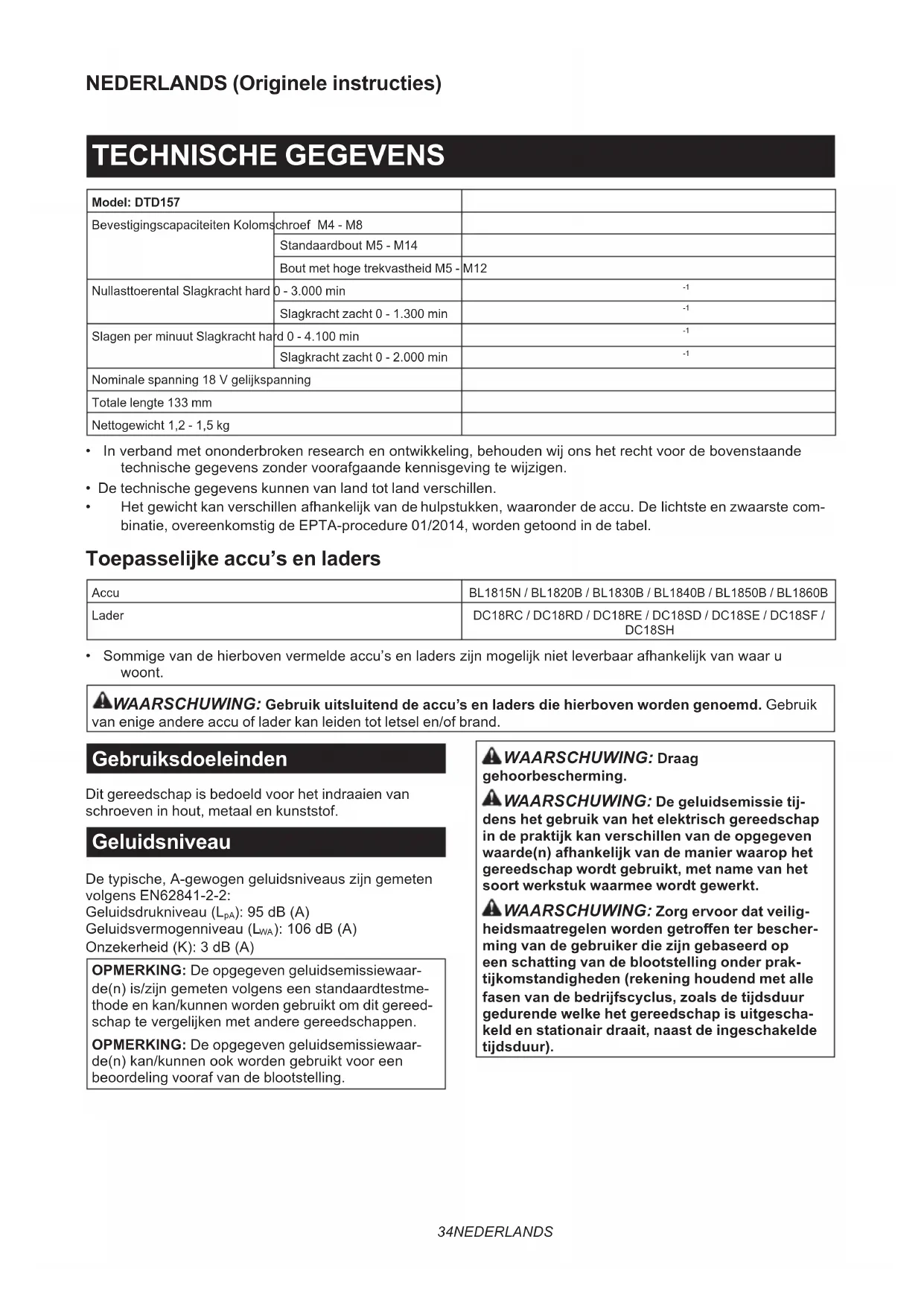 - Sommigevandehierbovenvermeldeaccu’senladerszijnmogelijknietleverbaarafhankelijkvanwaaru woont. WAARSCHUWING: Gebruik uitsluitend de accu’s en laders die hierboven worden genoemd. Gebruik van enige andere accu of lader kan leiden tot letsel en/of brand. Gebruiksdoeleinden Dit gereedschap is bedoeld voor het indraaien van schroeven in hout, metaal en kunststof. Geluidsniveau Detypische,A-gewogengeluidsniveauszijngemeten volgens EN62841-2-2: Geluidsdrukniveau(L
