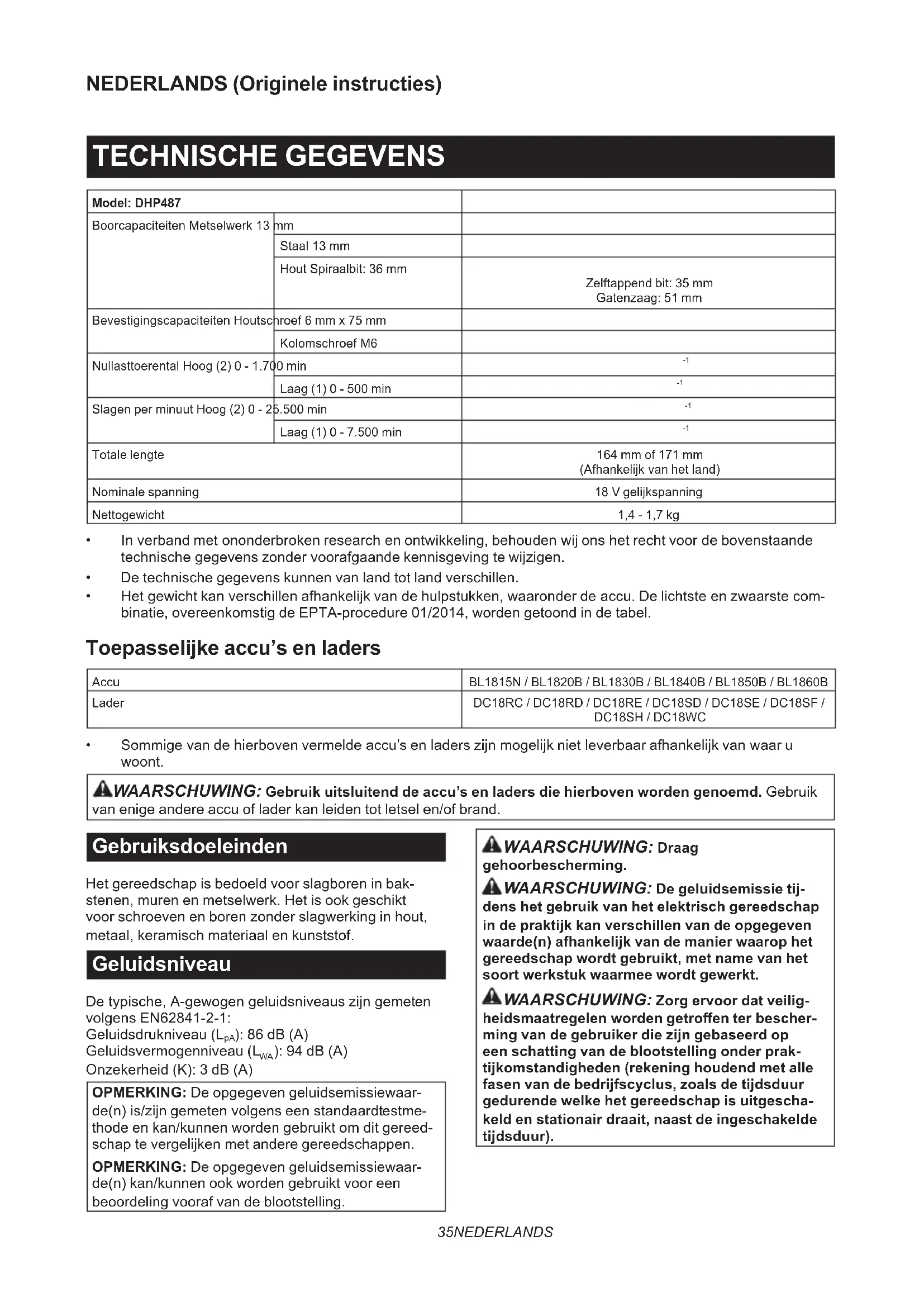 OPMERKING: De totale trillingswaarde(n) is/zijn gemeten volgens een standaardtestmethode en kan/ kunnen worden gebruikt om dit gereedschap te ver- gelijken met andere gereedschappen. OPMERKING: De opgegeven totale trillingswaar- de(n) kan/kunnen ook worden gebruikt voor een beoordeling vooraf van de blootstelling. WAARSCHUWING: De trillingsemissie tij- dens het gebruik van het elektrisch gereedschap in de praktijk kan verschillen van de opgegeven waarde(n) afhankelijk van de manier waarop het gereedschap wordt gebruikt, met name van het soort werkstuk waarmee wordt gewerkt. WAARSCHUWING: Zorg ervoor dat veilig- heidsmaatregelen worden getroen ter bescher- ming van de gebruiker die zijn gebaseerd op een schatting van de blootstelling onder prak- tijkomstandigheden (rekening houdend met alle fasen van de bedrijfscyclus, zoals de tijdsduur gedurende welke het gereedschap is uitgescha- keld en stationair draait, naast de ingeschakelde tijdsduur). Verklaringen van conformiteit Alleen voor Europese landen De verklaringen van conformiteit zijn bijgevoegd in Bijlage A bij deze gebruiksaanwijzing. VEILIGHEIDSWAAR- SCHUWINGEN Algemene veiligheidswaarschuwingen voor elektrisch gereedschap WAARSCHUWING: Lees alle veiligheids- waarschuwingen, aanwijzingen, afbeeldingen en technische gegevens behorend bij dit elektrische gereedschap aandachtig door. Als u niet alle onder- staande aanwijzingen naleeft, kan dat resulteren in brand, elektrische schokken en/of ernstig letsel. Bewaar alle waarschuwingen en instructies om in de toekomst te kunnen raadplegen. De term "elektrisch gereedschap" in de veiligheidsvoor- schriften duidt op gereedschappen die op stroom van het lichtnet werken (met snoer) of gereedschappen met een accu (snoerloos). Veiligheidswaarschuwingen voor een accuklopboor/-schroefmachine Veiligheidsinstructies voor alle werkzaamheden