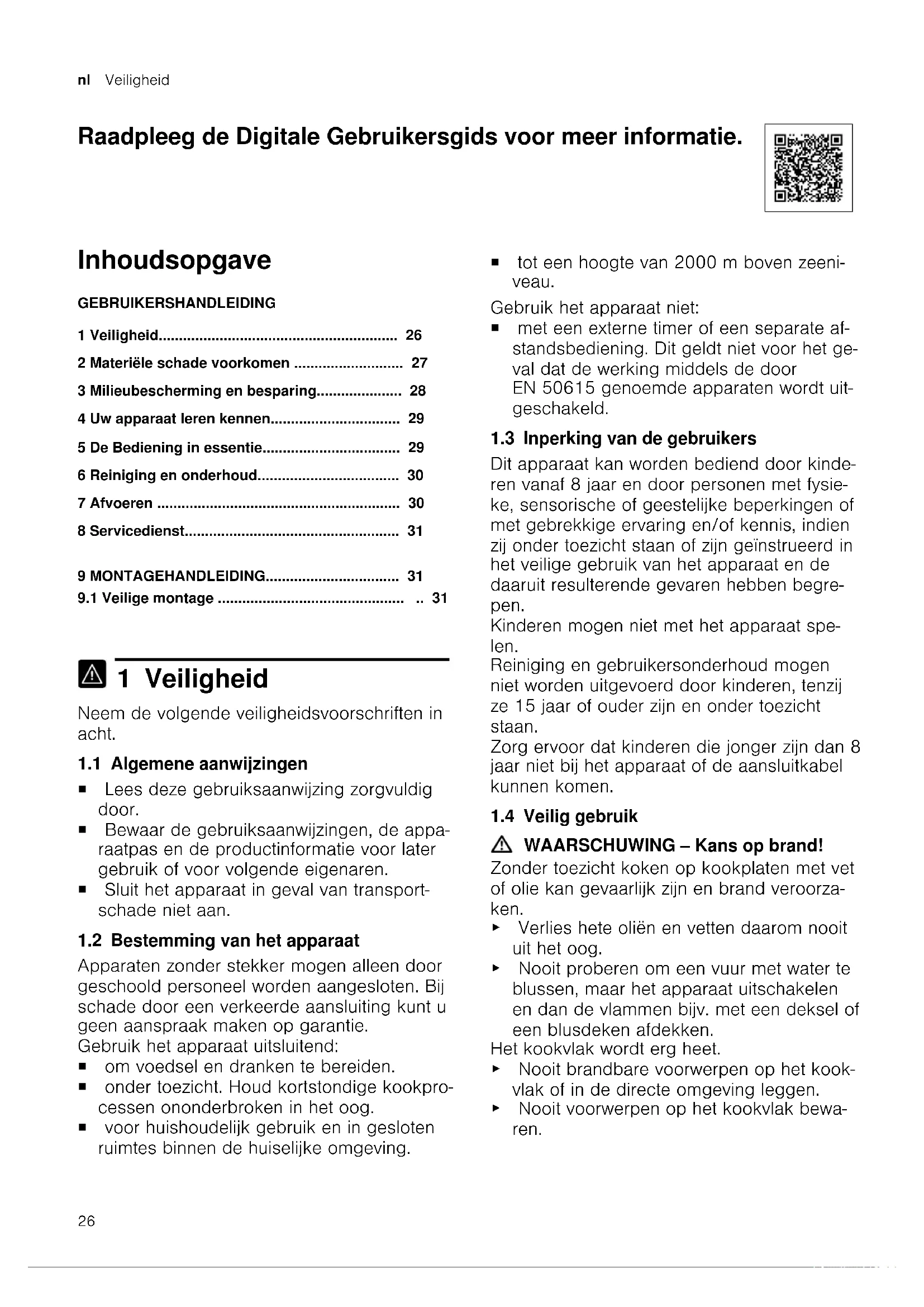 1 Veiligheid Neem de volgende veiligheidsvoorschriften in acht. 1.1 Algemene aanwijzingen ¡ Lees deze gebruiksaanwijzing zorgvuldig door. ¡ Bewaar de gebruiksaanwijzingen, de appa- raatpas en de productinformatie voor later gebruik of voor volgende eigenaren. ¡ Sluit het apparaat in geval van transport- schade niet aan. 1.2 Bestemming van het apparaat Apparaten zonder stekker mogen alleen door geschoold personeel worden aangesloten. Bij schade door een verkeerde aansluiting kunt u geen aanspraak maken op garantie. Gebruik het apparaat uitsluitend: ¡ om voedsel en dranken te bereiden. ¡ onder toezicht. Houd kortstondige kookpro- cessen ononderbroken in het oog. ¡ voor huishoudelijk gebruik en in gesloten ruimtes binnen de huiselijke omgeving. ¡ tot een hoogte van 2000m boven zeeni- veau. Gebruik het apparaat niet: ¡ met een externe timer of een separate af- standsbediening. Dit geldt niet voor het ge- val dat de werking middels de door EN50615 genoemde apparaten wordt uit- geschakeld. 1.3 Inperking van de gebruikers Dit apparaat kan worden bediend door kinde- ren vanaf 8 jaar en door personen met fysie- ke, sensorische of geestelijke beperkingen of met gebrekkige ervaring en/of kennis, indien zij onder toezicht staan of zijn geïnstrueerd in het veilige gebruik van het apparaat en de daaruit resulterende gevaren hebben begre- pen. Kinderen mogen niet met het apparaat spe- len. Reiniging en gebruikersonderhoud mogen niet worden uitgevoerd door kinderen, tenzij ze 15jaar of ouder zijn en onder toezicht staan. Zorg ervoor dat kinderen die jonger zijn dan 8 jaar niet bij het apparaat of de aansluitkabel kunnen komen. 1.4 Veilig gebruik WAARSCHUWING‒Kans op brand! Zonder toezicht koken op kookplaten met vet of olie kan gevaarlijk zijn en brand veroorza- ken. ▶ Verlies hete oliën en vetten daarom nooit uit het oog. ▶ Nooit proberen om een vuur met water te blussen, maar het apparaat uitschakelen en dan de vlammen bijv. met een deksel of een blusdeken afdekken. Het kookvlak wordt erg heet. ▶ Nooit brandbare voorwerpen op het kook- vlak of in de directe omgeving leggen. ▶ Nooit voorwerpen op het kookvlak bewa- ren.Materiële schade voorkomen nl