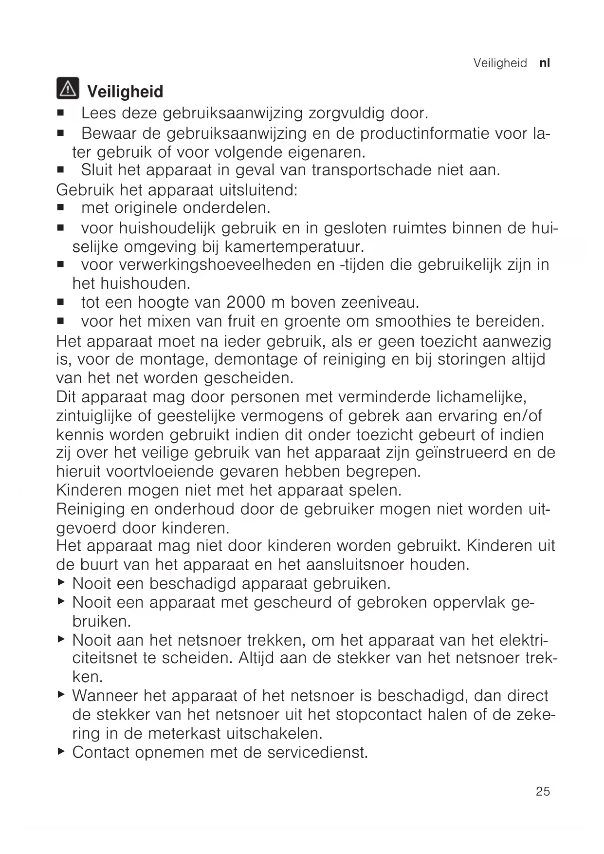 Veiligheid ¡ Lees deze gebruiksaanwijzing zorgvuldig door. ¡ Bewaar de gebruiksaanwijzing en de productinformatie voor la- ter gebruik of voor volgende eigenaren. ¡ Sluit het apparaat in geval van transportschade niet aan. Gebruik het apparaat uitsluitend: ¡ met originele onderdelen. ¡ voor huishoudelijk gebruik en in gesloten ruimtes binnen de hui- selijke omgeving bij kamertemperatuur. ¡ voor verwerkingshoeveelheden en -tijden die gebruikelijk zijn in het huishouden. ¡ tot een hoogte van 2000m boven zeeniveau. ¡ voor het mixen van fruit en groente om smoothies te bereiden. Het apparaat moet na ieder gebruik, als er geen toezicht aanwezig is, voor de montage, demontage of reiniging en bij storingen altijd van het net worden gescheiden. Dit apparaat mag door personen met verminderde lichamelijke, zintuiglijke of geestelijke vermogens of gebrek aan ervaring en/of kennis worden gebruikt indien dit onder toezicht gebeurt of indien zij over het veilige gebruik van het apparaat zijn geïnstrueerd en de hieruit voortvloeiende gevaren hebben begrepen. Kinderen mogen niet met het apparaat spelen. Reiniging en onderhoud door de gebruiker mogen niet worden uit- gevoerd door kinderen. Het apparaat mag niet door kinderen worden gebruikt. Kinderen uit de buurt van het apparaat en het aansluitsnoer houden.