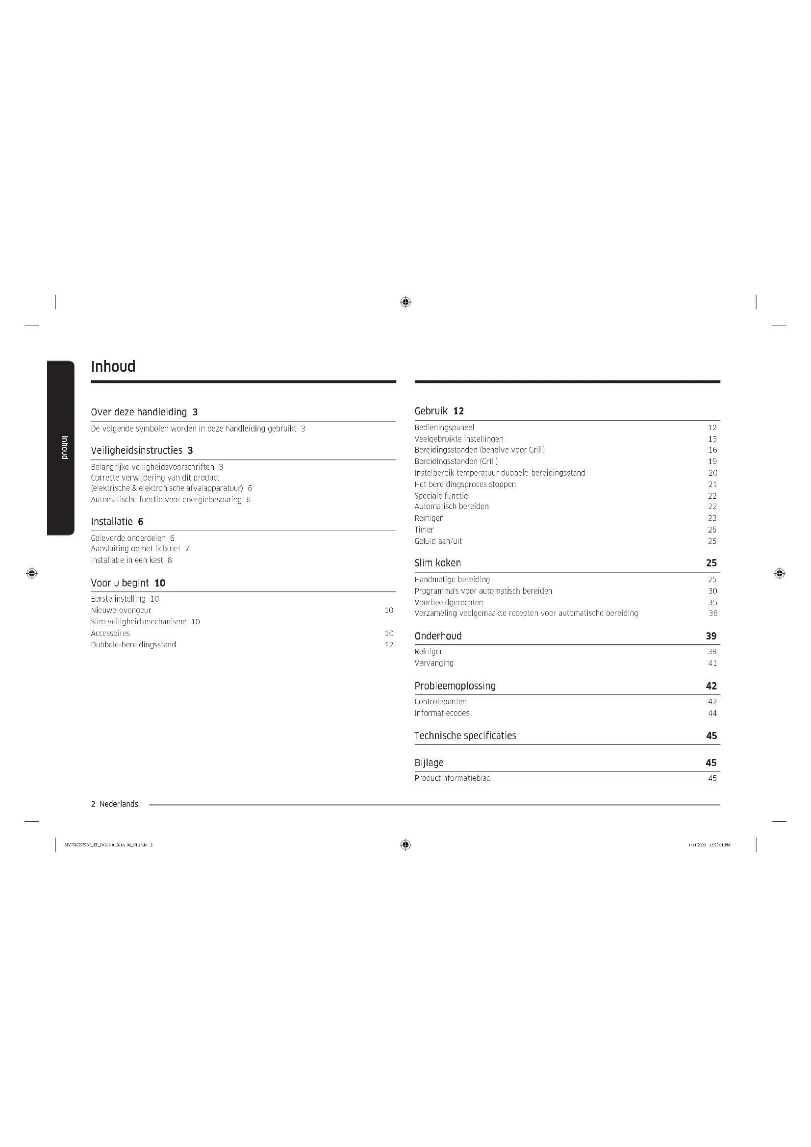 www.samsung.com/be/support (Dutch) www.samsung.com/be_fr/support (French) DENMARK 707 019 70 www.samsung.com/dk/support FINLAND 030-6227 515 www.samsung.com/fi/support FRANCE 01 48 63 00 00 www.samsung.com/fr/support GERMANY 06196 77 555 77 www.samsung.com/de/support ITALIA 800-SAMSUNG (800.7267864) www.samsung.com/it/support CYPRUS 8009 4000 only from landline, toll free www.samsung.com/gr/support GREECE 80111-SAMSUNG (80111 726 7864) only from land line (+30) 210 6897691 from mobile and land line www.samsung.com/gr/support LUXEMBURG 261 03 710 www.samsung.com/be_fr/support NETHERLANDS 088 90 90 100 www.samsung.com/nl/support NORWAY 21629099 www.samsung.com/no/support PORTUGAL 808 207 267 www.samsung.com/pt/support SPAIN 91 175 00 15 www.samsung.com/es/support SWEDEN 0771 726 786 www.samsung.com/se/support SWITZERLAND 0800 726 786 (0800-SAMSUNG) www.samsung.com/ch/support (German) www.samsung.com/ch_fr/support (French) UK 0330 SAMSUNG (7267864) www.samsung.com/uk/support IRELAND (EIRE) 0818 717100 www.samsung.com/ie/support DG68-01264A-00 NV75K5575BT_EF_DG68-01264A-00_FR.indd 48 1/14/2020 12:57:55 PMInbouwoven Installatie- en gebruikershandleiding NV75K5571** / NV75M5572** / NV75K5575** NV75K5575BT_EF_DG68-01264A-00_NL.indd 1 1/14/2020 12:55:00 PM2 Nederlands Inhoud Inhoud Over deze handleiding 3 De volgende symbolen worden in deze handleiding gebruikt 3 Veiligheidsinstructies 3 Belangrijke veiligheidsvoorschriften 3 Correcte verwijdering van dit product (elektrische & elektronische afvalapparatuur) 6 Automatische functie voor energiebesparing 6 Installatie 6 Geleverde onderdelen 6 Aansluiting op het lichtnet 7 Installatie in een kast 8 Voor u begint 10 Eerste instelling 10 Nieuwe-ovengeur 10 Slim veiligheidsmechanisme 10 Accessoires 10 Dubbele-bereidingsstand 12 Gebruik 12 Bedieningspaneel 12 Veelgebruikte instellingen 13 Bereidingsstanden (behalve voor Grill) 16 Bereidingsstanden (Grill) 19 Instelbereik temperatuur dubbele-bereidingsstand 20 Het bereidingsproces stoppen 21 Speciale functie 22 Automatisch bereiden 22 Reinigen 23 Timer 25 Geluid aan/uit 25 Slim koken 25 Handmatige bereiding 25 Programma's voor automatisch bereiden 30 Voorbeeldgerechten 35 Verzameling veelgemaakte recepten voor automatische bereiding 36 Onderhoud 39 Reinigen 39 Vervanging 41 Probleemoplossing 42 Controlepunten 42 Informatiecodes 44 Technische specificaties 45 Bijlage 45 Productinformatieblad 45 NV75K5575BT_EF_DG68-01264A-00_NL.indd 2 1/14/2020 12:55:01 PMNederlands 3 Over deze handleiding Over deze handleiding Hartelijk dank voor uw aanschaf van deze inbouwoven van SAMSUNG. Deze gebruikershandleiding bevat belangrijke informatie over veiligheid en instructies die u helpen bij de bediening en het onderhoud van dit apparaat. Lees voor gebruik deze handleiding zorgvuldig door en bewaar deze voor raadpleging in de toekomst. De volgende symbolen worden in deze handleiding gebruikt WAARSCHUWING Risico's of onveilige situaties die kunnen leiden tot ernstig lichamelijk letsel, overlijden en/of schade aan eigendommen. VOORZICHTIG Risico's of onveilige situaties die kunnen leiden tot lichamelijk letsel en/of schade aan eigendommen. OPMERKING Handige tips, aanbevelingen of informatie over het gebruik van het product. Veiligheidsinstructies Deze oven mag alleen worden geïnstalleerd door een bevoegd elektricien. De installateur is verantwoordelijk voor de aansluiting op de stroomvoorziening met inachtneming van de relevante veiligheidsaanbevelingen. Belangrijke veiligheidsvoorschriften WAARSCHUWING Dit apparaat is niet bedoeld voor gebruik door personen (inclusief kinderen) met een verminderd fysiek, zintuiglijk of mentaal vermogen, of met onvoldoende ervaring en kennis, tenzij deze toestemming of instructies met betrekking tot het gebruik van het apparaat hebben gekregen van een persoon die verantwoordelijk is voor hun veiligheid. Kinderen dienen onder toezicht te worden gehouden om te voorkomen dat ze met het apparaat gaan spelen. De mogelijkheid om het apparaat los te koppelen, moet zijn ingebouwd in de vaste bedrading overeenkomstig de richtlijnen voor bedrading. Dit apparaat moet na installatie nog van het stroomnet kunnen worden losgekoppeld. U kunt in loskoppeling van het apparaat voorzien door de stekker toegankelijk te laten of door een schakelaar in de bedrading in te bouwen overeenkomstig de richtlijnen voor bedrading. Als het netsnoer is beschadigd, moet u het laten vervangen door de fabrikant of de onderhoudsdienst van de leverancier, of door een andere gekwalificeerde monteur, om gevaarlijke situaties te voorkomen. NV75K5575BT_EF_DG68-01264A-00_NL.indd 3 1/14/2020 12:55:01 PM4 Nederlands Veiligheidsinstructies Veiligheidsinstructies Voor de bevestigingsmethode mogen geen kleefstoffen worden gebruikt, aangezien deze niet als een betrouwbare bevestigingsmethode worden beschouwd. Dit apparaat kan door kinderen vanaf acht jaar en door personen met een verminderd fysiek, zintuiglijk of mentaal vermogen, of gebrek aan ervaring en kennis, worden gebruikt als ze onder toezicht staan of instructies hebben gekregen omtrent het veilige gebruik van het apparaat en ze de risico's begrijpen. Kinderen mogen niet met het apparaat spelen. Kinderen mogen alleen onder toezicht reinigings- en onderhoudswerkzaamheden uitvoeren. Houd het apparaat en het netsnoer buiten het bereik van kinderen die jonger dan acht jaar zijn. Het apparaat wordt heet tijdens het gebruik. Zorg ervoor dat u de verwarmingselementen binnen in de oven nooit aanraakt. WAARSCHUWING: Bereikbare onderdelen kunnen heet worden tijdens het gebruik. Houd jonge kinderen uit de buurt. Gebruik geen ruwe schuurmiddelen of metalen schrapers voor het reinigen van de glazen ovendeur. Het oppervlak raakt hierdoor bekrast, waardoor het glas kan barsten. Als dit apparaat over een reinigingsfunctie beschikt, moet gemorst voedsel voor de reiniging worden verwijderd en moet alle kookgerei uit de oven worden verwijderd tijdens stoomreiniging of zelfreiniging. De aanwezig