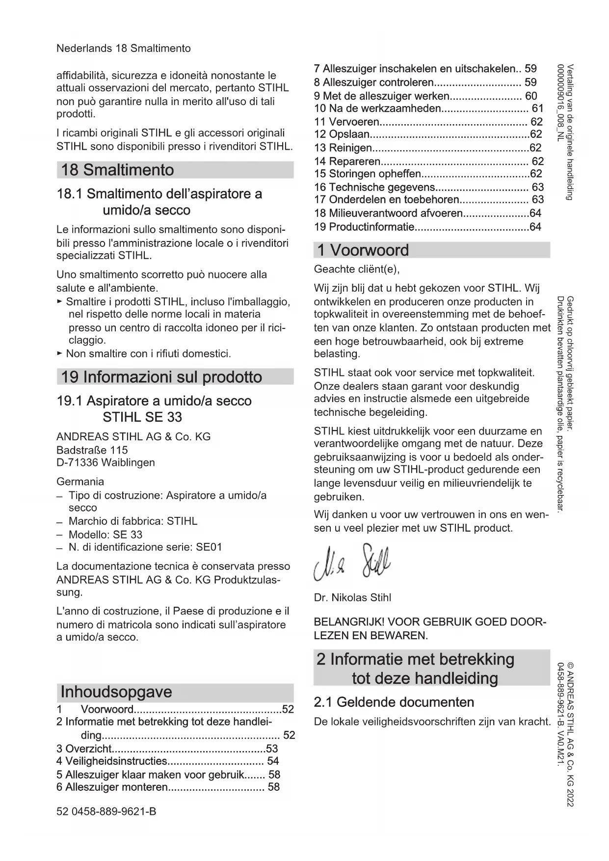 Serie-identificatie: SE01 De technische documentatie wordt bij de pro‐ ductgoedkeuring van ANDREAS STIHL AG & Co. KG bewaard. Het productiejaar, het productieland en het machinenummer staan vermeld op de alleszui‐ ger. Nederlands 18 Milieuverantwoord afvoeren 64 0458-889-9621-B19 Productinformatie Nederlands 0458-889-9621-B 65Nederlands 19 Productinformatie 66 0458-889-9621-B19 Productinformatie Nederlands 0458-889-9621-B 67www.stihl.com *04588899621B* *04588899621B* 0458-889-9621-B 0458-889-9621-B