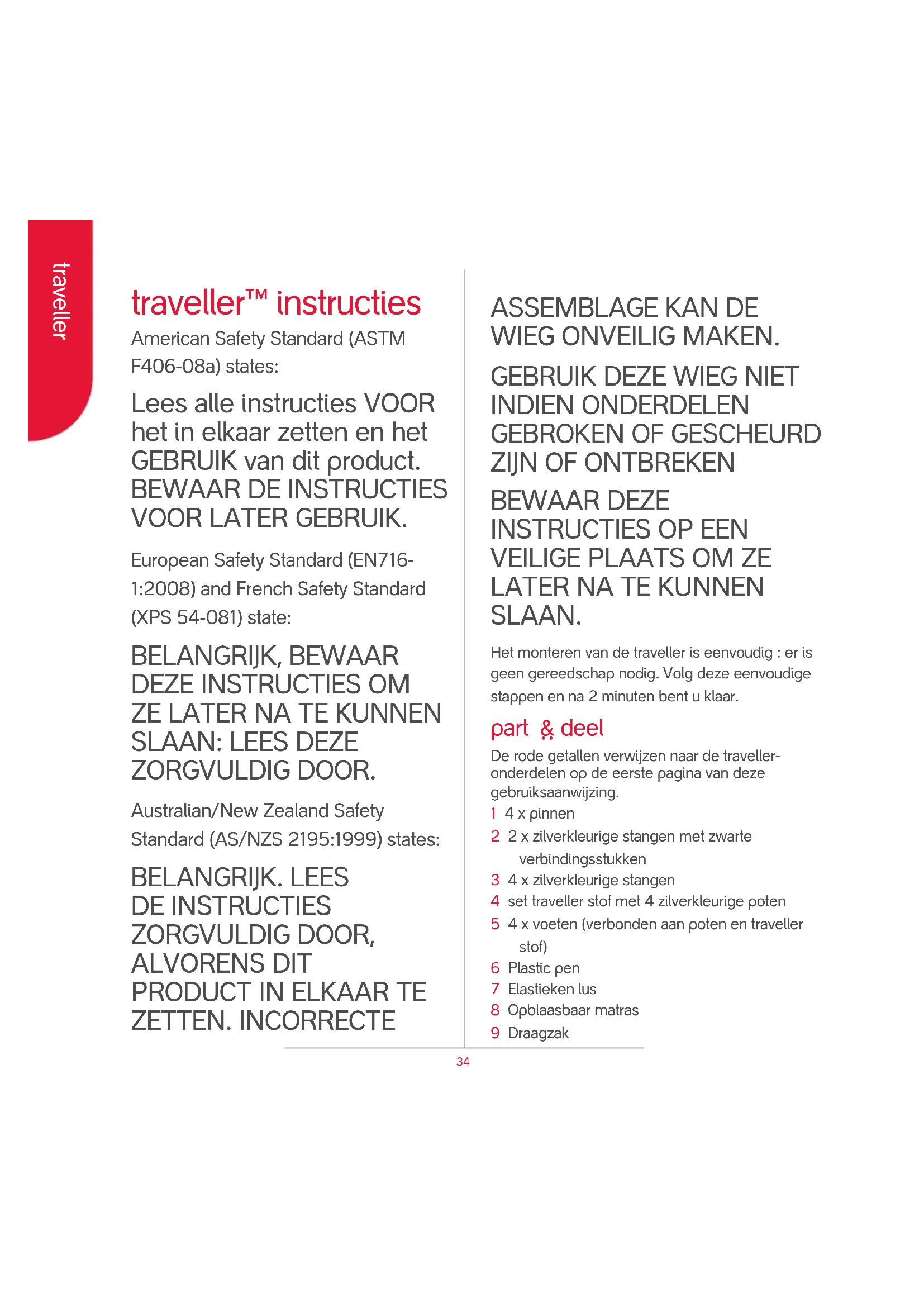 SLAAN. Het monteren van de traveller is eenvoudig : er is geen gereedschap nodig. Volg deze eenvoudige stappen en na 2 minuten bent u klaar. part ~ deel De rode getallen verwijzen naar de traveller-onderdelen op de eerste pagina van deze gebruiksaanwijzing.1 4 x pinnen2 2 x zilverkleurige stangen met zwarte verbindingsstukken 3 4 x zilverkleurige stangen4 set traveller stof met 4 zilverkleurige poten 5 4 x voeten (verbonden aan poten en traveller stof)6 Plastic pen7 Elastieken lus8 Opblaasbaar matras 9 Draagzak 34nederlands veilig ~ heilig De volgende veiligheidsstandaarden zijn van toepassing :