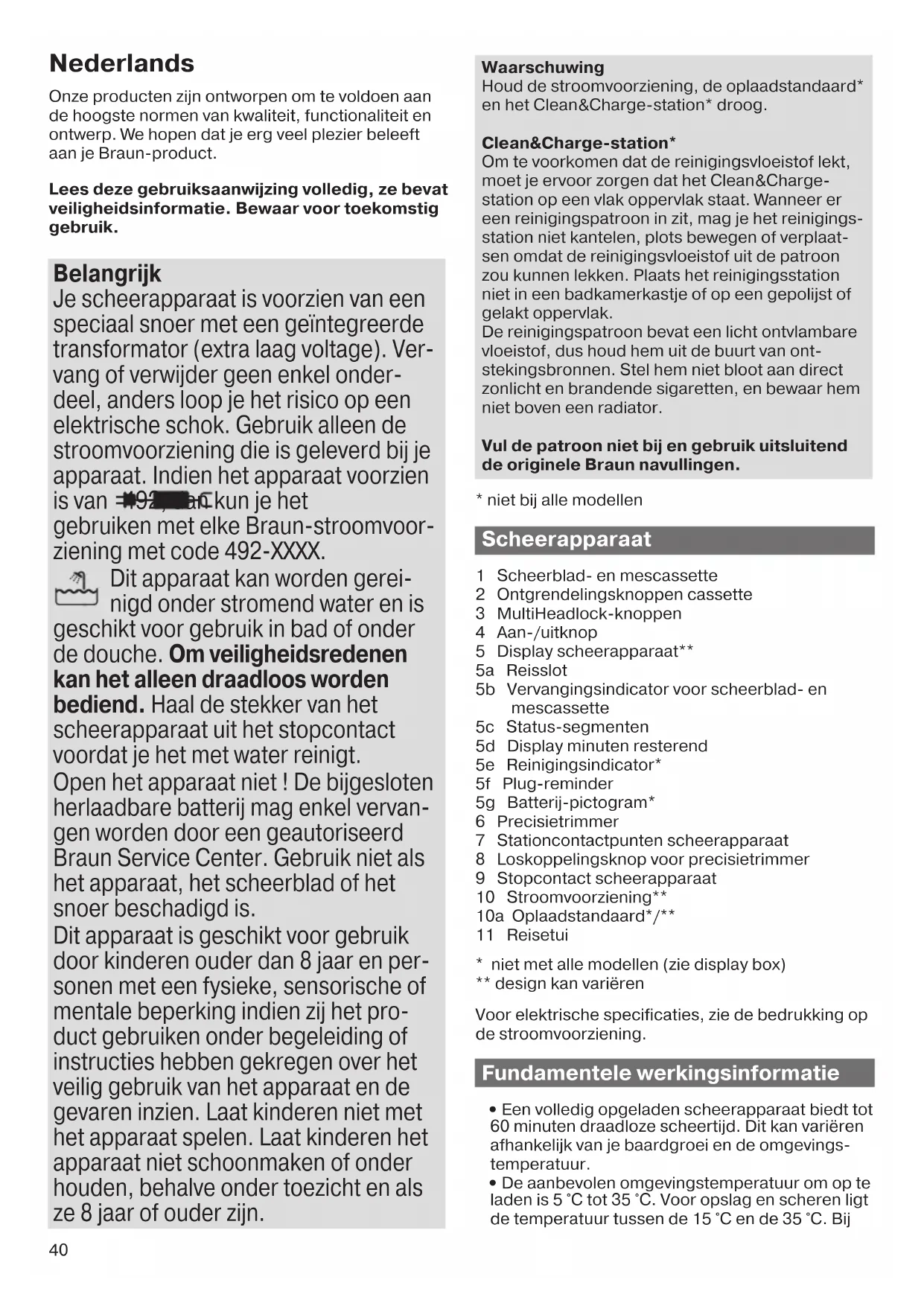 Maggiore consumo del liquido di pulizia. Lo scarico della stazione di pulizia Clean&Charge è ostruito. – Pulire lo scarico con uno stuzzicadenti in legno. – Pulire regolarmente la vasca con un panno. 91818830_83XXcc_W&D_MN_Type_5795.indd 3991818830_83XXcc_W&D_MN_Type_5795.indd 39 09.05.18 09:1509.05.18 09:15 Business Use - P&G AUTHORIZED POA-00044767 Rev 001 Effective Date 2018-05-14 Printed 2018-07-25 Page 39 of 7240 Nederlands Onze producten zijn ontworpen om te voldoen aan de hoogste normen van kwaliteit, functionaliteit en ontwerp. We hopen dat je erg veel plezier beleeft aan je Braun-product. Lees deze gebruiksaanwijzing volledig, ze bevat veiligheidsinformatie. Bewaar voor toekomstig gebruik. Belangrijk Je scheerapparaat is voorzien van een speciaal snoer met een geïntegreerde transformator (extra laag voltage). Ver- vang of verwijder geen enkel onder- deel, anders loop je het risico op een elektrische schok. Gebruik alleen de stroomvoorziening die is geleverd bij je apparaat. Indien het apparaat voorzien is van 492, dan kun je het gebruiken met elke Braun-stroomvoor- ziening met code 492-XXXX. Dit apparaat kan worden gerei- nigd onder stromend water en is geschikt voor gebruik in bad of onder de douche. Om veiligheidsredenen kan het alleen draadloos worden bediend. Haal de stekker van het scheerapparaat uit het stopcontact voordat je het met water reinigt. Open het apparaat niet ! De bijgesloten herlaadbare batterij mag enkel vervan- gen worden door een geautoriseerd Braun Service Center. Gebruik niet als het apparaat, het scheerblad of het snoer beschadigd is. Dit apparaat is geschikt voor gebruik door kinderen ouder dan 8 jaar en per- sonen met een fysieke, sensorische of mentale beperking indien zij het pro- duct gebruiken onder begeleiding of instructies hebben gekregen over het veilig gebruik van het apparaat en de gevaren inzien. Laat kinderen niet met het apparaat spelen. Laat kinderen het apparaat niet schoonmaken of onder houden, behalve onder toezicht en als ze 8 jaar of ouder zijn. Waarschuwing Houd de stroomvoorziening, de oplaadstandaard* en het Clean&Charge-station* droog. Clean&Charge-station* Om te voorkomen dat de reinigingsvloeistof lekt, moet je ervoor zorgen dat het Clean&Charge- station op een vlak oppervlak staat. Wanneer er een reinigingspatroon in zit, mag je het reinigings- station niet kantelen, plots bewegen of verplaat- sen omdat de reinigingsvloeistof uit de patroon zou kunnen lekken. Plaats het reinigingsstation niet in een badkamerkastje of op een gepolijst of gelakt oppervlak. De reinigingspatroon bevat een licht ontvlambare vloeistof, dus houd hem uit de buurt van ont- stekingsbronnen. Stel hem niet bloot aan direct zonlicht en brandende sigaretten, en bewaar hem niet boven een radiator. Vul de patroon niet bij en gebruik uitsluitend de originele Braun navullingen.
