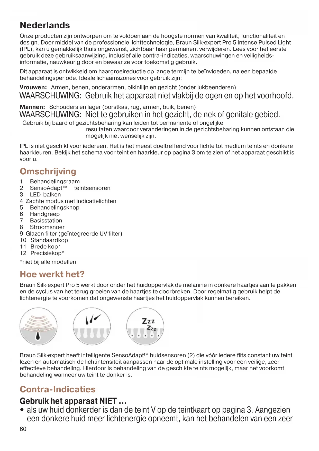 huidsensoren (2) die vóór iedere flits constant uw teint lezen en automatisch de lichtintensiteit aanpassen naar de optimale instelling voor een veilige, zeer effectieve behandeling. Hierdoor is behandeling van de geschikte teints mogelijk, maar het voorkomt behandeling wanneer uw teint te donker is. Contra-Indicaties Gebruik het apparaat NIET ...