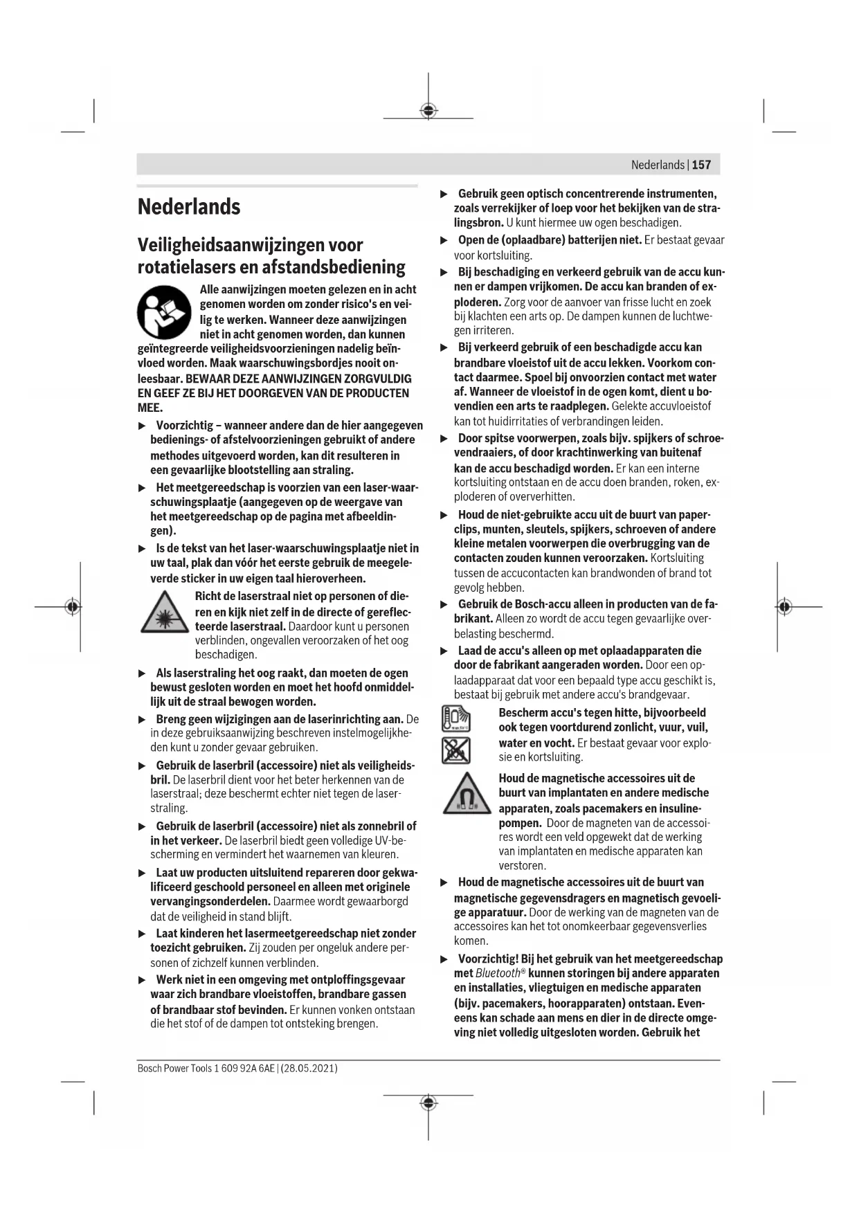 100m – Gebruiksfrequentiebereik 2402–2480MHz – Zendvermogen max. 6,3mW Batterijen 2×1,5V LR6(AA) Gewicht volgens EPTA-Procedure01:2014 0,17kg Afmetingen (lengte×breedte×hoogte) 122×59×27mm 1 609 92A 6AE | (28.05.2021) Bosch Power ToolsNederlands | 161 Afstandsbediening RC 6 Beschermklasse IP54 A) Er ontstaat slechts een niet geleidende vervuiling, waarbij echter soms een tijdelijke geleidbaarheid wort verwacht door bedauwing. B) Bij Bluetooth®-Low-Energy-toestellen kan, afhankelijk van model en besturingssysteem, eventueel het opbouwen van een verbinding niet mogelijk zijn. Bluetooth®-toestellen moeten het SPP-profiel ondersteunen. C) Het bereik kan afhankelijk van externe omstandigheden, met inbegrip van de gebruikte ontvanger, sterk variëren. Binnen gesloten ruimten en door metalen barrières (bijv. muren, schappen, koffers, etc.) kan het Bluetooth®-bereik duidelijk worden beperkt. Montage Energievoorziening meetgereedschap Het meetgereedschap kan met in de handel verkrijgbare bat- terijen of met een Bosch lithiumionaccu worden gebruikt. Gebruik geen gangbare accu's (bijv. nikkel-metaalhydride). Gebruik met accu u Gebruik alleen de in de technische gegevens vermelde oplaadapparaten. Alleen deze oplaadapparaten zijn af- gestemd op de Li-Ion-accu die bij uw meetgereedschap moet worden gebruikt. Aanwijzing: Het gebruik van accu's die niet geschikt zijn voor uw meetgereedschap, kan leiden tot storingen of be- schadiging van het meetgereedschap. Aanwijzing: De accu wordt gedeeltelijk geladen geleverd. Om de volledige capaciteit van de accu te verkrijgen, laadt u voor het eerste gebruik de accu volledig in het oplaadappa- raat op. De Lithium-Ion-accu kan op elk moment worden opgeladen zonder de levensduur te verkorten. Een onderbreking van het opladen schaadt de accu niet. De Li-Ion-accu is door de „Electronic Cell Protection (ECP)“ tegen diepontlading beschermd. Als de accu leeg is, wordt het elektrische gereedschap door een veiligheidsschakeling uitgeschakeld. u Het meetgereedschap niet opnieuw inschakelen, na- dat het door de veiligheidsschakeling is uitgescha- keld. De accu kan anders beschadigd worden. Accu-oplaadaanduiding Als de accu uit het meetgereedschap wordt genomen, kan de laadtoestand door de groene LED's van de oplaadaandui- ding op de accu worden aangegeven. Druk op de toets voor de oplaadaanduiding of om de laadtoestand aan te geven. Als er na het drukken op de toets voor de oplaadaanduiding geen LED brandt, dan is de accu defect en moet vervangen worden. Accutype GBA 18V... LED's Capaciteit Permanent licht 3× groen 60−100% Permanent licht 2× groen 30−60% Permanent licht 1× groen 5−30% LED's Capaciteit Knipperlicht 1× groen 0−5% Accutype ProCORE18V... LED's Capaciteit Permanent licht 5× groen 80−100 % Permanent licht 4× groen 60−80 % Permanent licht 3× groen 40−60 % Permanent licht 2× groen 20−40 % Permanent licht 1× groen 5−20 % Knipperlicht 1× groen 0−5 % Aanwijzingen voor de optimale omgang met de accu Bescherm de accu tegen vocht en water. Bewaar de accu alleen bij een temperatuur tussen –20 °C en 50 °C. Laat de accu bijvoorbeeld in de zomer niet in de auto liggen. Reinig de ventilatieopeningen van de accu af en toe met een zachte, schone en droge doek. Een duidelijk kortere gebruiksduur na het opladen duidt erop dat de accu versleten is en moet worden vervangen. Neem de aanwijzingen met betrekking tot afvalverwijdering in acht. Gebruik met batterijen Voor het gebruik van het meetgereedschap wordt het ge- bruik van alkali-mangaanbatterijen aanbevolen. Plaats de batterijen in de batterijadapter(22). Let er hierbij op dat de polen juist worden geplaatst volgens de afbeelding op de batterijadapter. u De batterij-adapter is uitsluitend bedoeld voor het ge- bruik in de betreffende Bosch-meetgereedschappen en mag niet bij elektrische gereedschappen worden gebruikt. Vervang altijd alle batterijen tegelijk. Gebruik alleen batterij- en van één fabrikant en met dezelfde capaciteit. u Haal de batterijen uit het meetgereedschap, wanneer u dit langere tijd niet gebruikt. De batterijen kunnen bij een langere periode van opslag in het meetgereedschap corroderen en zichzelf ontladen. Bosch Power Tools 1 609 92A 6AE | (28.05.2021)162 | Nederlands Accu/batterijen vervangen (zie afbeeldingA) Voor het vervangen van accu/batterijen schuift u de vergrendeling(2) van het batterijvakdeksel in stand en klapt u het batterijvakdeksel(1) open. Schuif ofwel een geladen accu(24) of de batterijadapter(22) met geplaatste batterijen zo ver in het batterijvak dat deze merkbaar vastklikt. Voor het verwijderen van de accu(24) of batterijadapter(22) drukt u op de ontgrendelingstoets(23) en trekt u de accu of batterijadapter uit het batterijvak. Ge- bruik daarbij geen geweld. Sluit het batterijvakdeksel(1) en schuif de vergrendeling(2) in stand . Oplaadindicatie De oplaadaanduiding(d) op het display geeft de laadtoe- stand van de accu of batterijen aan: Aandui- ding Capaciteit 60–100% 30–60% 5–30% 0–5% Als de accu of batterijen leeg zijn, ver- schijnt gedurende enkele seconden een waarschuwingsmelding en de statusaanduiding(12) knippert rood in een snel ritme. Daarna wordt het meetgereedschap uitgeschakeld. Energievoorziening afstandsbediening Voor de werking van de afstandsbediening wordt het gebruik van alkali-mangaan-batterijen aangeraden. Draai de vergrendeling(37) van het batterijvakdeksel (bijv. met een muntstuk) in stand . Klap het batterijvakdeksel (39) open en plaats de batterijen. Let er hierbij op dat de polen juist worden geplaatst volgens de afbeelding op de binnenkant van het batterijvak. Sluit het batterijvakdeksel(39) en draai de vergrendeling(37) van het batterijvakdeksel in stand . u Verwijder de batterijen uit de afstandsbediening, wanneer u deze langere tijd niet gebruikt. De batterij- en kunnen bij een langere periode van opslag in de af- standsbediening corroderen en zichzelf ontladen. Aanwijzing: De functie Bluetooth® blij