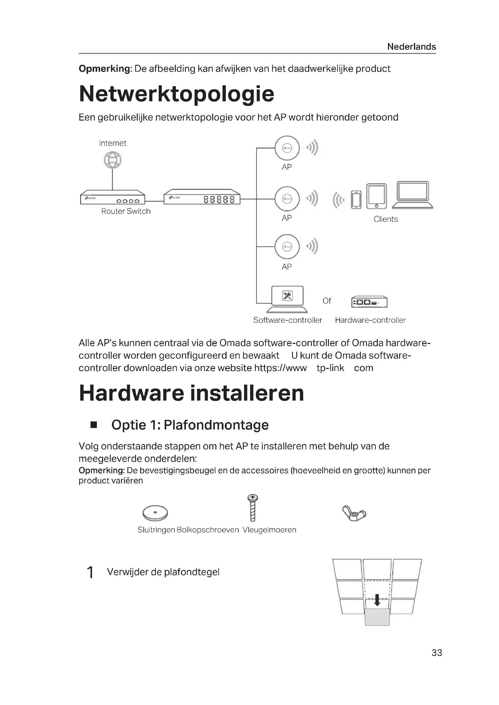 PoE LAN PoE-sovitinKytkin33 Nederlands Opmerking: De afbeelding kan afwijken van het daadwerkelijke product Netwerktopologie Een gebruikelijke netwerktopologie voor het AP wordt hieronder getoond Alle AP’s kunnen centraal via de Omada software-controller of Omada hardware- controller worden geconfigureerd en bewaakt U kunt de Omada software- controller downloaden via onze website https://wwwtp-linkcom Hardware installeren ■ Optie 1: Plafondmontage Volg onderstaande stappen om het AP te installeren met behulp van de meegeleverde onderdelen: Opmerking: De bevestigingsbeugel en de accessoires (hoeveelheid en grootte) kunnen per product variërenSluitringen Bolkopschroeven Vleugelmoeren