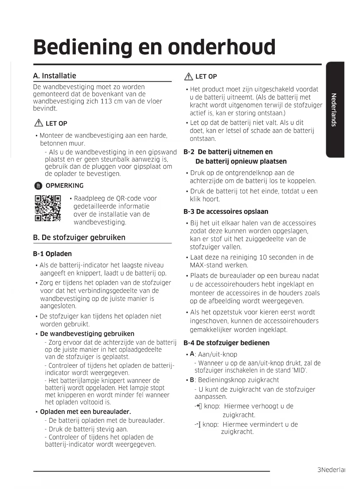 - Raadpleeg de QR-code voor gedetailleerde informatie over de installatie van de wandbevestiging. B. De stofzuiger gebruiken B-1 Opladen