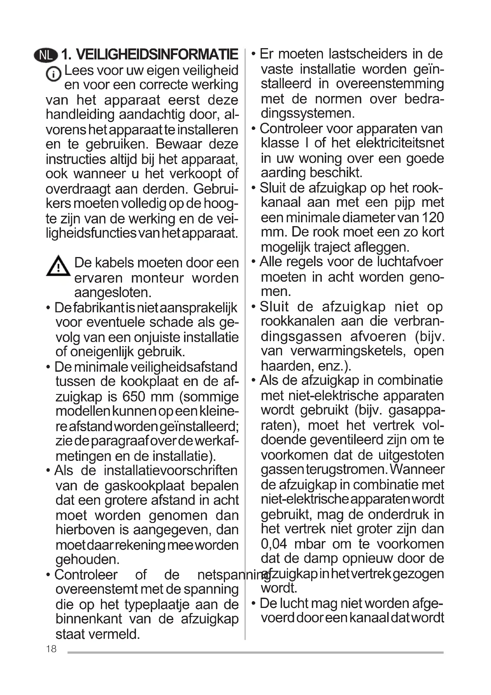 Lees voor uw eigen veiligheid en voor een correcte werking van het apparaat eerst deze handleiding aandachtig door, al- vorens het apparaat te installeren en te gebruiken. Bewaar deze instructies altijd bij het apparaat, ook wanneer u het verkoopt of overdraagt aan derden. Gebrui- kers moeten volledig op de hoog- te zijn van de werking en de vei- ligheidsfuncties van het apparaat. De kabels moeten door een ervaren monteur worden aangesloten.