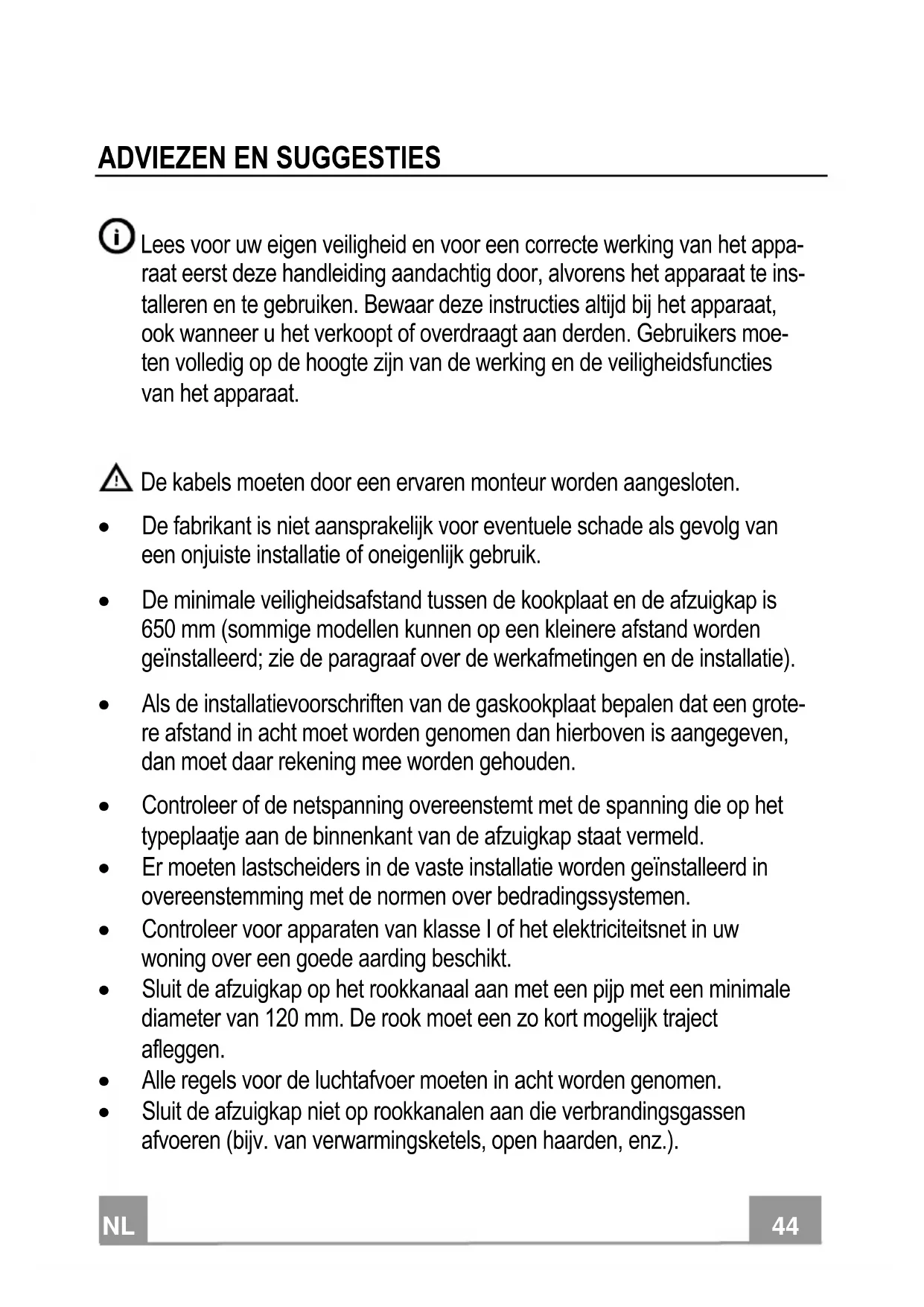 Lees voor uw eigen veiligheid en voor een correcte werking van het appa- raat eerst deze handleiding aandachtig door, alvorens het apparaat te ins- talleren en te gebruiken. Bewaar deze instructies altijd bij het apparaat, ook wanneer u het verkoopt of overdraagt aan derden. Gebruikers moe- ten volledig op de hoogte zijn van de werking en de veiligheidsfuncties van het apparaat. De kabels moeten door een ervaren monteur worden aangesloten. De fabrikant is niet aansprakelijk voor eventuele schade als gevolg van een onjuiste installatie of oneigenlijk gebruik. De minimale veiligheidsafstand tussen de kookplaat en de afzuigkap is 650 mm (sommige modellen kunnen op een kleinere afstand worden geïnstalleerd; zie de paragraaf over de werkafmetingen en de installatie). Als de installatievoorschriften van de gaskookplaat bepalen dat een grote- re afstand in acht moet worden genomen dan hierboven is aangegeven, dan moet daar rekening mee worden gehouden. Controleer of de netspanning overeenstemt met de spanning die op het typeplaatje aan de binnenkant van de afzuigkap staat vermeld. Er moeten lastscheiders in de vaste installatie worden geïnstalleerd in overeenstemming met de normen over bedradingssystemen. Controleer voor apparaten van klasse I of het elektriciteitsnet in uw woning over een goede aarding beschikt. Sluit de afzuigkap op het rookkanaal aan met een pijp met een minimale diameter van 120 mm. De rook moet een zo kort mogelijk traject afleggen. Alle regels voor de luchtafvoer moeten in acht worden genomen. Sluit de afzuigkap niet op rookkanalen aan die verbrandingsgassen afvoeren (bijv. van verwarmingsketels, open haarden, enz.).NL