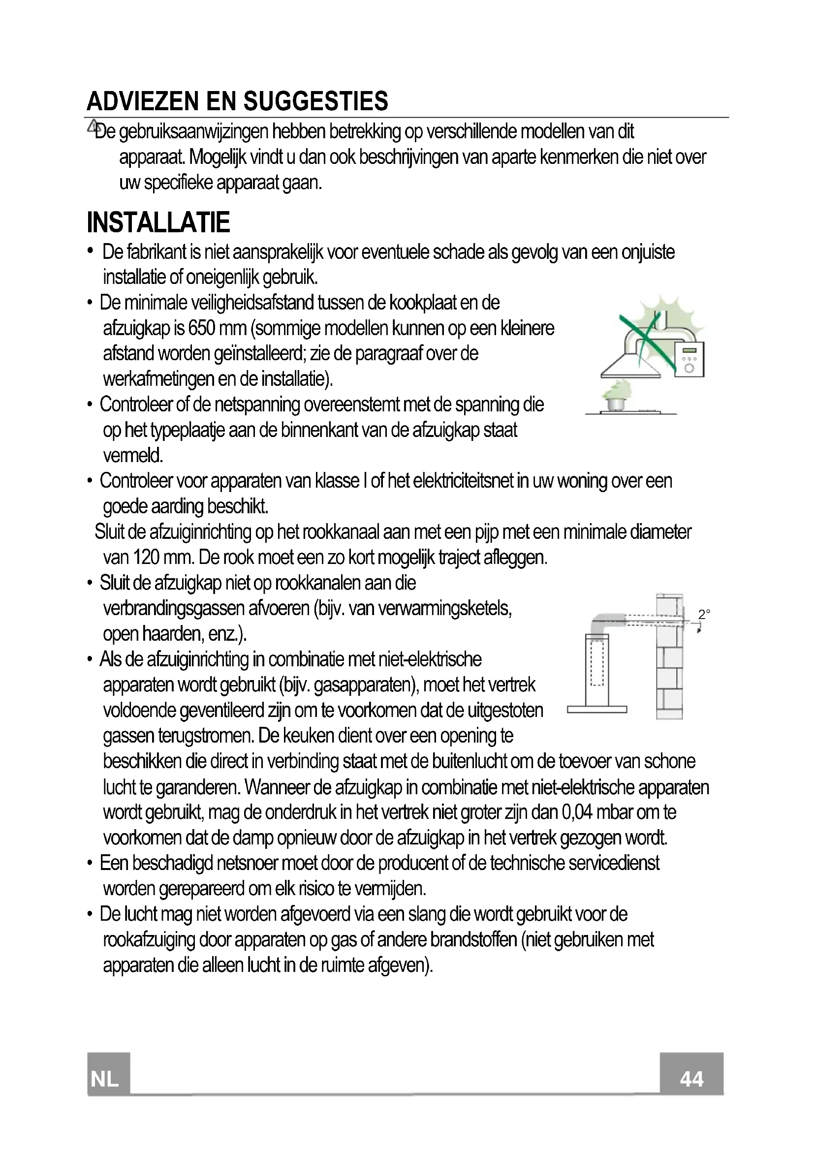- Controleer voor apparaten van klasse I of het elektriciteitsnet in uw woning over een goede aarding beschikt. Sluit de afzuiginrichting op het rookkanaal aan met een pijp met een minimale diameter van 120 mm. De rook moet een zo kort mogelijk traject afleggen.