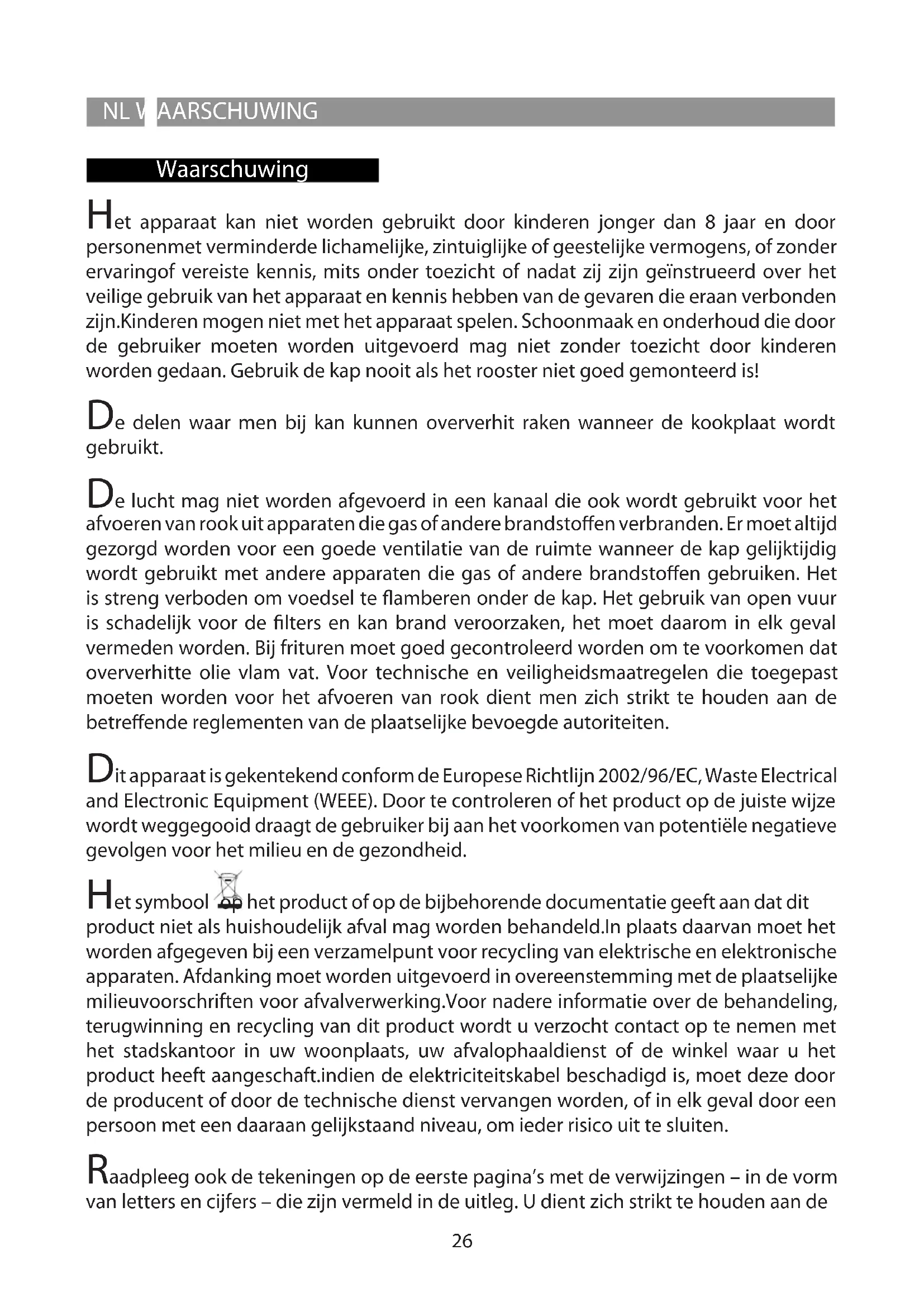 Titolo F ENTRETIEN Entretien Veillez a débrancher la hotte du réseau électrique avant toute intervention sur celle- ci. Nettoyage La hotte doit être nettoyée fréquemment tant à l’intérieur (à l’exception de la zone derrière le ltre à graisse) qu’à l’extérieur. Pour le nettoyage, utilisez un chion imbibé d’alcool dénaturé ou des détergents liquides neutres. Évitez d’utiliser des produits à base d’abrasifs. Attention Le non respect des règles de nettoyage de la hotte, de la substitution et du nettoyage des ltres comporte des risques d’incendie. Nous recommandons donc vivement de respecter ces instructions. Filtre antigraisse doit être nettoyé une fois par mois avec un détergent non agressif, à la main ou dans le lave vaisselle à basse température et pendant un cycle court. Le lavage du ltre anti-graisse métallique au lave-vaisselle peut en provoquer la décoloration. Toutefois, les caractéristiques de ltrage ne seront en aucun cas modiées. Filtre à charbon (seulement pour les versions ltrantes) Le ltre à charbons actifs F n’est ni lavable ni recyclable. En cas d’usage normal, il doit être remplacé tous les 6 mois. Il retient les mauvaises odeurs issues de la cuisson. Changement de l’ampoule Attention! Avant de toucher les lampes, assurez-vous qu’elles soient froides. LAMPES À LED En cas de dysfonctionnement du groupe d’éclairage à leds, contactez le service d’assistance technique pour remplacer la totalité du groupe. Réduction de l’impact environnemental: Pour contenir les consommations de l’électroménager, il est conseiller de toujours utiliser la vitesse d’aspiration la plus basse parmi celles les plus adaptées au type de cuisson en cours, de ne pas laisser le dispositif en fonction pour plus de 15 minutes après l’arrêt des feux et de toujours éteindre les lumières si le consommateur s’éloigne de la zone de cuisson.2526 Waarschuwing NL WAARSCHUWING Het apparaat kan niet worden gebruikt door kinderen jonger dan 8 jaar en door personenmet verminderde lichamelijke, zintuiglijke of geestelijke vermogens, of zonder ervaringof vereiste kennis, mits onder toezicht of nadat zij zijn geïnstrueerd over het veilige gebruik van het apparaat en kennis hebben van de gevaren die eraan verbonden zijn.Kinderen mogen niet met het apparaat spelen. Schoonmaak en onderhoud die door de gebruiker moeten worden uitgevoerd mag niet zonder toezicht door kinderen worden gedaan. Gebruik de kap nooit als het rooster niet goed gemonteerd is! De delen waar men bij kan kunnen oververhit raken wanneer de kookplaat wordt gebruikt. De lucht mag niet worden afgevoerd in een kanaal die ook wordt gebruikt voor het afvoeren van rook uit apparaten die gas of andere brandstoen verbranden. Er moet altijd gezorgd worden voor een goede ventilatie van de ruimte wanneer de kap gelijktijdig wordt gebruikt met andere apparaten die gas of andere brandstoen gebruiken. Het is streng verboden om voedsel te amberen onder de kap. Het gebruik van open vuur is schadelijk voor de lters en kan brand veroorzaken, het moet daarom in elk geval vermeden worden. Bij frituren moet goed gecontroleerd worden om te voorkomen dat oververhitte olie vlam vat. Voor technische en veiligheidsmaatregelen die toegepast moeten worden voor het afvoeren van rook dient men zich strikt te houden aan de betreende reglementen van de plaatselijke bevoegde autoriteiten. Dit apparaat is gekentekend conform de Europese Richtlijn 2002/96/EC, Waste Electrical and Electronic Equipment (WEEE). Door te controleren of het product op de juiste wijze wordt weggegooid draagt de gebruiker bij aan het voorkomen van potentiële negatieve gevolgen voor het milieu en de gezondheid. Het symbool op het product of op de bijbehorende documentatie geeft aan dat dit product niet als huishoudelijk afval mag worden behandeld.In plaats daarvan moet het worden afgegeven bij een verzamelpunt voor recycling van elektrische en elektronische apparaten. Afdanking moet worden uitgevoerd in overeenstemming met de plaatselijke milieuvoorschriften voor afvalverwerking.Voor nadere informatie over de behandeling, terugwinning en recycling van dit product wordt u verzocht contact op te nemen met het stadskantoor in uw woonplaats, uw afvalophaaldienst of de winkel waar u het product heeft aangeschaft.indien de elektriciteitskabel beschadigd is, moet deze door de producent of door de technische dienst vervangen worden, of in elk geval door een persoon met een daaraan gelijkstaand niveau, om ieder risico uit te sluiten. Raadpleeg ook de tekeningen op de eerste pagina’s met de verwijzingen – in de vorm van letters en cijfers – die zijn vermeld in de uitleg. U dient zich strikt te houden aan de27 NLWAARSCHUWING aanwijzingen in deze gebruiksaanwijzing. Elke aansprakelijkheid voor eventuele ongelukken, schade of brand veroorzaakt door het apparaat, voortkomend uit het niet opvolgen van de instructies in deze gebruiksaanwijzing, wordt afgewezen. Aangeraden wordt om de kap niet te bevestigen aan een muur die het gewicht niet kan dragen, bijvoorbeeld een wand van gipskarton, en om het apparaat niet in een kast in te bouwen. In het geval van een elektrisch fornuis moet de afzuigkap minstens 65 cm van de kookplaat afgelegen zijn en 65 cm in geval van gas of gemengd fornuis. Indien in de installatie-aanwijzing van het gaskooktoestel een grotere afstand wordt aangegeven moet hiermee rekening worden gehouden. De afzuigkap is voorzien van een boven luchtafvoer B voor de afvoer van rook naar buiten in geval van modellen met schoorsteen C (Zuigversie A - afvoerbuis niet bijgeleverd). In het geval dat het niet mogelijk is dampen en rook naar buiten af te voeren ook al is men voorzien van het model met schoorsteen C, kan de afzuigkap in de lterversie F gebruikt worden door de montage van 1 koolstolter F, de rook en de dampen worden gerecycleerd door middel van het bovenrooster G. Controleer of er in de buurt van de kap een elektrisch sto