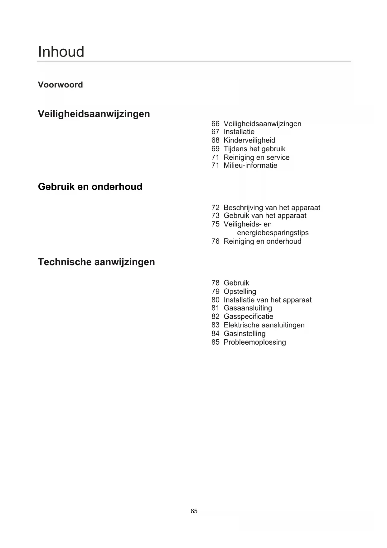 ■ Si le problème n’a pas pu être résolu, veuillez contacter le service clientèle.65 Inhoud Voorwoord Veiligheidsaanwijzingen 66 Veiligheidsaanwijzingen 67 Installatie 68 Kinderveiligheid 69 Tijdens het gebruik 71 Reiniging en service 71 Milieu-informatie Gebruik en onderhoud 72 Beschrijving van het apparaat 73 Gebruik van het apparaat 75 Veiligheids- en energiebesparingstips 76 Reiniging en onderhoud Technische aanwijzingen 78 Gebruik 79 Opstelling 80 Installatie van het apparaat 81 Gasaansluiting 82 Gasspecificatie 83 Elektrische aansluitingen 84 Gasinstelling 85 Probleemoplossing66 Veiligheidsaanwijzingen ■ Neem de tijd, deze gebruiksaanwijzing te lezen, voor u het apparaat installeert of gebruikt. ■ Deze gebruiksaanwijzing moet worden bewaard voor alle toekomstige vragen. Wanneer het apparaat wordt verkocht of aan een andere persoon overdragen, moet ook deze gebruiksaanwijzing aan de nieuwe gebruiker worden doorgegeven. ■ De fabrikant wijst elke aansprakelijkheid bij niet-naleving van deze veiligheidsmaatregelen af. ■ De volgende opmerkingen zijn zo opgesteld, dat ze gemakkelijk begrijpelijk zijn, zodat ongelukken door misbruik bij voorbaat vermeden en het apparaat comfortabeler bediend kan worden. ■ Lees de volgende hoofdstukken zorgvuldig door.