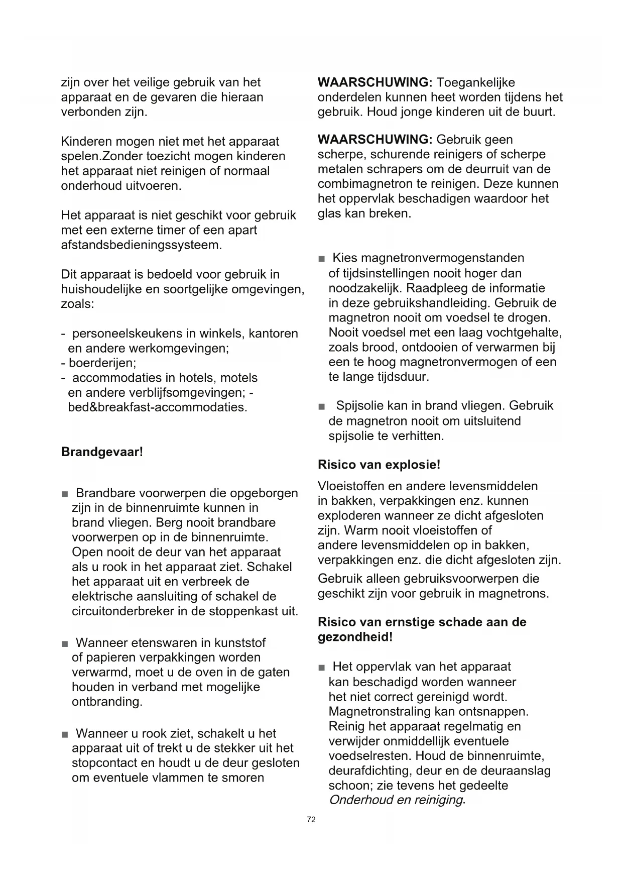 WAARSCHUWING: Wanneer de deur of de deurafdichtingen beschadigd zijn, mag de combimagnetron niet meer worden gebruikt, tot hij gerepareerd wordt door een vakkundige persoon. WAARSCHUWING: Het is gevaarlijk voor iedereen, uitgezonderd vakkundige personen, om onderhouds- of reparatiewerkzaamheden uit te voeren waarvoor een afdekking moet worden verwijderd die beschermt tegen blootstelling aan magnetronstraling. ■ Magnetronstraling kan ontsnappen wanneer de deur van de binnenruimte of de deurafdichting beschadigd is. Gebruik het apparaat nooit wanneer de deur van de binnenruimte of de deurafdichting beschadigd is. Neem contact op met de klantenservice. ■ Bij apparaten die geen behuizing hebben, zal magnetronstraling ontsnappen. Verwijder nooit de behuizing. Voor eventuele onderhouds- of reparatiewerkzaamheden neemt u contact op met de klantenservice. Risico van elektrische schok! ■ Ondeskundige reparaties zijn gevaarlijk. Het uitvoeren van reparaties en het vervangen van beschadigde netsnoeren mag alleen worden uitgevoerd door getrainde monteurs van de klantenservice. Wanneer het apparaat defect is, trekt u de stekker van het apparaat uit het stopcontact of u schakelt de circuitonderbreker in de stoppenkast uit. Neem contact op met de klantenservice. ■ De kabelisolatie van elektrische apparaten kan smelten wanneer ze in contact komen met hete onderdelen van het apparaat. Nooit kabels van elektrische apparaten in contact laten komen met hete onderdelen van het apparaat. ■ Binnendringend vocht kan een elektrische schok veroorzaken. Gebruik geen hogedrukreinigers of stoomreinigers. ■ Een defect apparaat kan een elektrische schok veroorzaken. Schakel nooit een defect apparaat in. Trek de stekker van het apparaat uit het stopcontact of schakel de circuitonderbreker in de stoppenkast uit. Neem contact op met de klantenservice. ■ Het apparaat werkt met hoogspanning. Verwijder nooit de behuizing. WAARSCHUWING: Zorg ervoor dat het apparaat uitgeschakeld is voordat u de lamp vervangt om de kans op een elektrische schok te vermijden. Risico van verbranding! ■ Tijdens gebruik kan het apparaat heet worden. Wees voorzichtig om aanraking van de verwarmingselementen in de oven te vermijden. ■ Accessoires en ovenschalen kunnen heel heet worden. Gebruik altijd ovenwanten om accessoires of ovenschalen uit de binnenruimte te pakken. ■ Alcoholische dampen kunnen in de hete binnenruimte in brand vliegen. Bereid nooit voedsel waarin een grote hoeveelheid drank met een hoog alcoholpercentage is verwerkt. Gebruik uitsluitend kleine hoeveelheden drank met een hoog alcolholpercentage. Open de deur van het apparaat voorzichtig. ■ Levensmiddelen met een schil of een vel kunnen tijdens of na verwarming exploderen. Kook nooit eieren in hun schaal of warm hardgekookte eieren74 opnieuw op. Kook nooit schelp- of schaaldieren. Prik altijd in de dooier wanneer u eieren bakt of pocheert. Bij etenswaren met een schil of een schaal, zoals appels, tomaten, aardappels en worstjes, kan de schil of het vel barsten. Voor opwarming de schil of huid doorprikken. ■ De inhoud van zuigessen en potjes met babyvoeding moeten worden doorgeroerd of geschud en de temperatuur moet voor gebruik worden gecontroleerd om brandwonden te vermijden. ■ Opgewarmd voedsel straalt warmte uit. De ovenschaal kan heet worden. Gebruik altijd ovenwanten om ovenschalen of accessoires uit de binnenruimte te pakken. WAARSCHUWING: Vloeistoffen en andere etenswaren mogen niet in dicht afgesloten verpakkingen worden verhit, omdat ze kunnen ontploffen.Raadpleeg altijd de instructies op de verpakking. Gebruik altijd ovenwanten om ovenschalen uit de binnenruimte te pakken. Risico van verbranding!