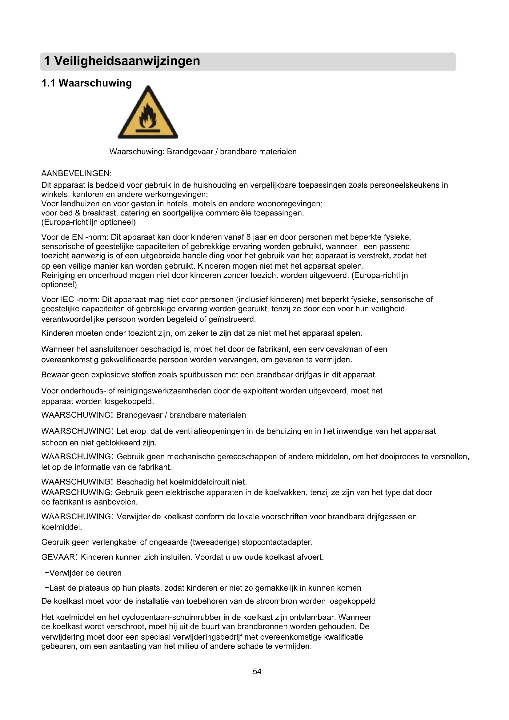 Waarschuwing: Brandgevaar / brandbare materialen AANBEVELINGEN: Dit apparaat is bedoeld voor gebruik in de huishouding en vergelijkbare toepassingen zoals personeelskeukens in winkels, kantoren en andere werkomgevingen; Voor landhuizen en voor gasten in hotels, motels en andere woonomgevingen; voor bed & breakfast, catering en soortgelijke commerciële toepassingen. (Europa-richtlijn optioneel) Voor de EN -norm: Dit apparaat kan door kinderen vanaf 8 jaar en door personen met beperkte fysieke, sensorische of geestelijke capaciteiten of gebrekkige ervaring worden gebruikt, wanneer een passend toezicht aanwezig is of een uitgebreide handleiding voor het gebruik van het apparaat is verstrekt, zodat het op een veilige manier kan worden gebruikt. Kinderen mogen niet met het apparaat spelen. Reiniging en onderhoud mogen niet door kinderen zonder toezicht worden uitgevoerd. (Europa-richtlijn optioneel) Voor IEC -norm: Dit apparaat mag niet door personen (inclusief kinderen) met beperkt fysieke, sensorische of geestelijke capaciteiten of gebrekkige ervaring worden gebruikt, tenzij ze door een voor hun veiligheid verantwoordelijke persoon worden begeleid of geïnstrueerd. Kinderen moeten onder toezicht zijn, om zeker te zijn dat ze niet met het apparaat spelen. Wanneer het aansluitsnoer beschadigd is, moet het door de fabrikant, een servicevakman of een overeenkomstig gekwalificeerde persoon worden vervangen, om gevaren te vermijden. Bewaar geen explosieve stoffen zoals spuitbussen met een brandbaar drijfgas in dit apparaat. Voor onderhouds- of reinigingswerkzaamheden door de exploitant worden uitgevoerd, moet het apparaat worden losgekoppeld. WAARSCHUWING: Brandgevaar / brandbare materialen WAARSCHUWING: Let erop, dat de ventilatieopeningen in de behuizing en in het inwendige van het apparaat schoon en niet geblokkeerd zijn. WAARSCHUWING: Gebruik geen mechanische gereedschappen of andere middelen, om het dooiproces te versnellen, let op de informatie van de fabrikant. WAARSCHUWING: Beschadig het koelmiddelcircuit niet. WAARSCHUWING: Gebruik geen elektrische apparaten in de koelvakken, tenzij ze zijn van het type dat door de fabrikant is aanbevolen. WAARSCHUWING: Verwijder de koelkast conform de lokale voorschriften voor brandbare drijfgassen en koelmiddel. Gebruik geen verlengkabel of ongeaarde (tweeaderige) stopcontactadapter. GEVAAR: Kinderen kunnen zich insluiten. Voordat u uw oude koelkast afvoert: -Verwijder de deuren -Laat de plateaus op hun plaats, zodat kinderen er niet zo gemakkelijk in kunnen komen De koelkast moet voor de installatie van toebehoren van de stroombron worden losgekoppeld Het koelmiddel en het cyclopentaan-schuimrubber in de koelkast zijn ontvlambaar. Wanneer de koelkast wordt verschroot, moet hij uit de buurt van brandbronnen worden gehouden. De verwijdering moet door een speciaal verwijderingsbedrijf met overeenkomstige kwalificatie gebeuren, om een aantasting van het milieu of andere schade te vermijden. 1 Veiligheidsaanwijzingen55