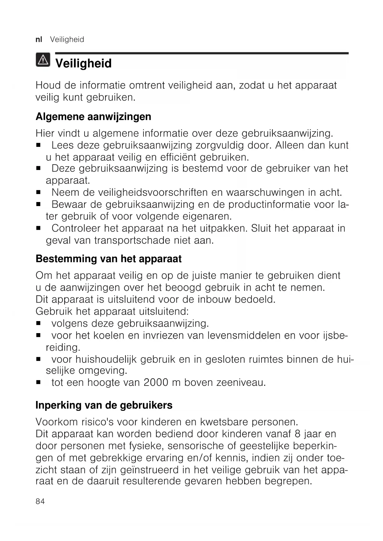 Veiligheid Houd de informatie omtrent veiligheid aan, zodat u het apparaat veilig kunt gebruiken. Algemene aanwijzingen Hier vindt u algemene informatie over deze gebruiksaanwijzing. ¡ Lees deze gebruiksaanwijzing zorgvuldig door. Alleen dan kunt u het apparaat veilig en efficiënt gebruiken. ¡ Deze gebruiksaanwijzing is bestemd voor de gebruiker van het apparaat. ¡ Neem de veiligheidsvoorschriften en waarschuwingen in acht. ¡ Bewaar de gebruiksaanwijzing en de productinformatie voor la- ter gebruik of voor volgende eigenaren. ¡ Controleer het apparaat na het uitpakken. Sluit het apparaat in geval van transportschade niet aan. Bestemming van het apparaat Om het apparaat veilig en op de juiste manier te gebruiken dient u de aanwijzingen over het beoogd gebruik in acht te nemen. Dit apparaat is uitsluitend voor de inbouw bedoeld. Gebruik het apparaat uitsluitend: ¡ volgens deze gebruiksaanwijzing. ¡ voor het koelen en invriezen van levensmiddelen en voor ijsbe- reiding. ¡ voor huishoudelijk gebruik en in gesloten ruimtes binnen de hui- selijke omgeving. ¡ tot een hoogte van 2000m boven zeeniveau. Inperking van de gebruikers Voorkom risico's voor kinderen en kwetsbare personen. Dit apparaat kan worden bediend door kinderen vanaf 8 jaar en door personen met fysieke, sensorische of geestelijke beperkin- gen of met gebrekkige ervaring en/of kennis, indien zij onder toe- zicht staan of zijn geïnstrueerd in het veilige gebruik van het appa- raat en de daaruit resulterende gevaren hebben begrepen.Veiligheid nl