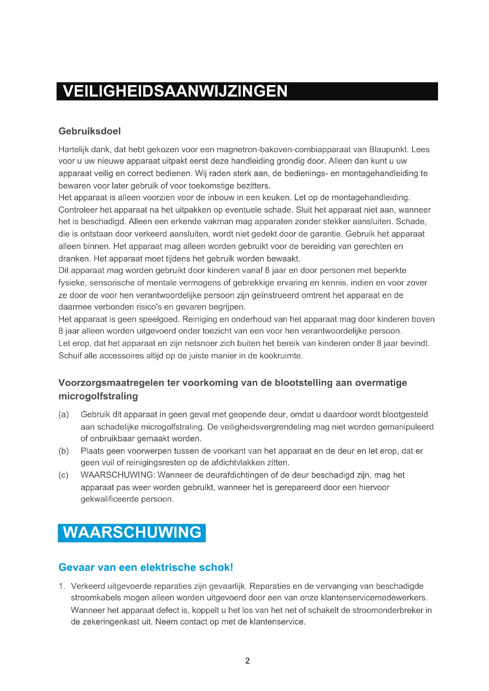 VEILIGHEIDSAANWIJZINGEN Gebruiksdoel Hartelijk dank, dat hebt gekozen voor een magnetron-bakoven-combiapparaat van Blaupunkt. Lees voor u uw nieuwe apparaat uitpakt eerst deze handleiding grondig door. Alleen dan kunt u uw apparaat veilig en correct bedienen. Wij raden sterk aan, de bedienings- en montagehandleiding te bewaren voor later gebruik of voor toekomstige bezitters. Het apparaat is alleen voorzien voor de inbouw in een keuken. Let op de montagehandleiding. Controleer het apparaat na het uitpakken op eventuele schade. Sluit het apparaat niet aan, wanneer het is beschadigd. Alleen een erkende vakman mag apparaten zonder stekker aansluiten. Schade, die is ontstaan door verkeerd aansluiten, wordt niet gedekt door de garantie. Gebruik het apparaat alleen binnen. Het apparaat mag alleen worden gebruikt voor de bereiding van gerechten en dranken. Het apparaat moet tijdens het gebruik worden bewaakt. Dit apparaat mag worden gebruikt door kinderen vanaf 8 jaar en door personen met beperkte fysieke, sensorische of mentale vermogens of gebrekkige ervaring en kennis, indien en voor zover ze door de voor hen verantwoordelijke persoon zijn geïnstrueerd omtrent het apparaat en de daarmee verbonden risico's en gevaren begrijpen. Het apparaat is geen speelgoed. Reiniging en onderhoud van het apparaat mag door kinderen boven 8 jaar alleen worden uitgevoerd onder toezicht van een voor hen verantwoordelijke persoon. Let erop, dat het apparaat en zijn netsnoer zich buiten het bereik van kinderen onder 8 jaar bevindt. Schuif alle accessoires altijd op de juiste manier in de kookruimte. Voorzorgsmaatregelen ter voorkoming van de blootstelling aan overmatige microgolfstraling (a) Gebruik dit apparaat in geen geval met geopende deur, omdat u daardoor wordt blootgesteld aan schadelijke microgolfstraling. De veiligheidsvergrendeling mag niet worden gemanipuleerd of onbruikbaar gemaakt worden. (b) Plaats geen voorwerpen tussen de voorkant van het apparaat en de deur en let erop, dat er geen vuil of reinigingsresten op de afdichtvlakken zitten. (c) WAARSCHUWING: Wanneer de deurafdichtingen of de deur beschadigd zijn, mag het apparaat pas weer worden gebruikt, wanneer het is gerepareerd door een hiervoor gekwalificeerde persoon. WAARSCHUWING Gevaar van een elektrische schok!