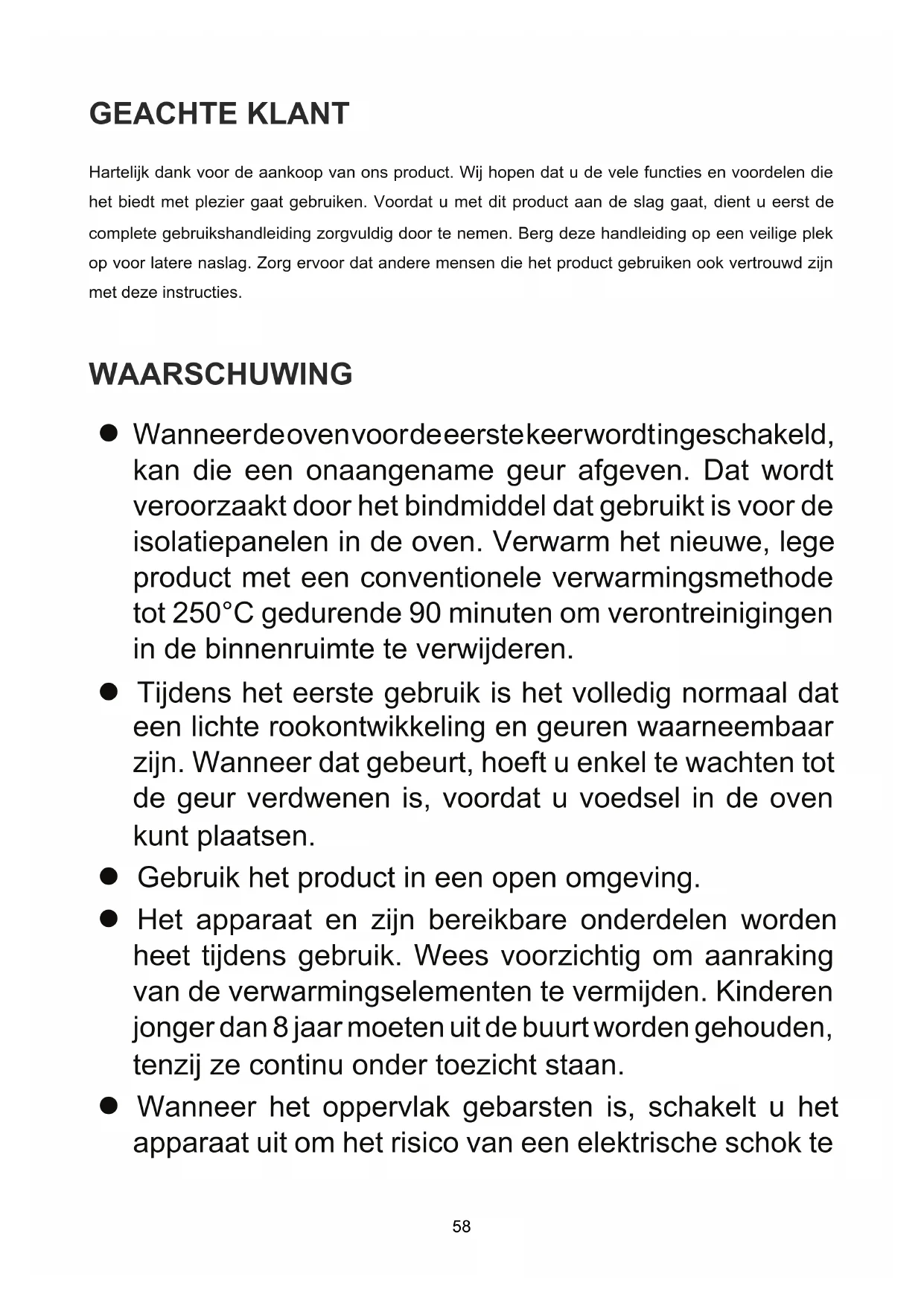 Wanneer de oven voor de eerste keer wordt ingeschakeld, kan die een onaangename geur afgeven. Dat wordt veroorzaakt door het bindmiddel dat gebruikt is voor de isolatiepanelen in de oven. Verwarm het nieuwe, lege product met een conventionele verwarmingsmethode tot 250°C gedurende 90 minuten om verontreinigingen in de binnenruimte te verwijderen. Tijdens het eerste gebruik is het volledig normaal dat een lichte rookontwikkeling en geuren waarneembaar zijn. Wanneer dat gebeurt, hoeft u enkel te wachten tot de geur verdwenen is, voordat u voedsel in de oven kunt plaatsen. Gebruik het product in een open omgeving. Het apparaat en zijn bereikbare onderdelen worden heet tijdens gebruik. Wees voorzichtig om aanraking van de verwarmingselementen te vermijden. Kinderen jonger dan 8 jaar moeten uit de buurt worden gehouden, tenzij ze continu onder toezicht staan. Wanneer het oppervlak gebarsten is, schakelt u het apparaat uit om het risico van een elektrische schok te 58voorkomen. Dit apparaat kan worden gebruikt door kinderen van 8 jaar en ouder en personen met verminderde lichamelijke, sensorische of mentale vaardigheden of gebrek aan ervaring en kennis wanneer ze onder toezicht staan of geïnstrueerd zijn over het veilige gebruik van het apparaat en de gevaren die hieraan verbonden zijn. Kinderen mogen niet met het apparaat spelen. Zonder toezicht mogen kinderen het apparaat niet reinigen of normaal onderhoud uitvoeren. Tijdens het gebruik kan het apparaat zeer heet worden. Wees voorzichtig om aanraking van de verwarmingselementen in de oven te vermijden. Laat kinderen nooit in de buurt van de oven, wanneer die in gebruik is, met name wanneer de grill wordt gebruikt. Zorg ervoor dat het apparaat uitgeschakeld is voordat u de ovenlamp vervangt om de kans op een elektrische schok te vermijden. De onderbreking moet in de vaste stroomkring worden ingebouwd conform de aansluitspecicaties. Kinderen moeten onder toezicht staan, zodat ze niet met het apparaat gaan spelen. Dit apparaat is niet bedoeld voor gebruik door personen (waaronder kinderen) met verminderde lichamelijke, sensorische of mentale vaardigheden, of gebrek aan ervaring en kennis, tenzij ze onder toezicht staan of geïnstrueerd zijn over het gebruik van het apparaat 59door een persoon die verantwoordelijk is voor hun veiligheid. Toegankelijke onderdelen kunnen heet worden tijdens het gebruik. Houd jonge kinderen uit de buurt. Een alpolige schakelaar moet in de vaste stroomkring worden ingebouwd conform de installatievoorschriften. Wanneer het netsnoer beschadigd is, moet het door de fabrikant, zijn onderhoudscentrum of personen met overeenkomstige kwalicaties worden vervangen, om gevaren te voorkomen. Gebruik geen scherpe, schurende reinigers of scherpe metalen schrapers om de deurruit van de oven te reinigen. Deze kunnen het oppervlak be schadigen waardoor het glas kan breken.