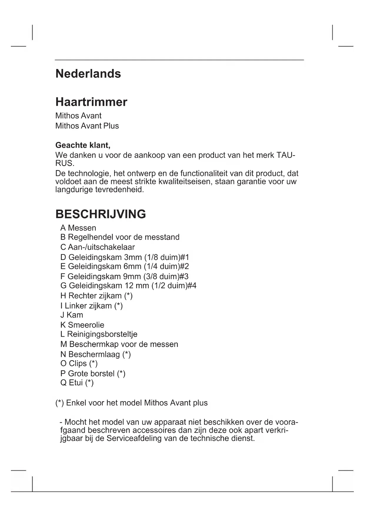 NOTES PRÈVIES A L’ÚS: - Asseguri’s que ha retirat tot el material d’embalatge del producte COL·LOCACIÓ D’UNA PINTA GUIA: (FIG 1) - Per a col·locar la pinta guia, subjecti’l pels seus dos extrems i estrenyi contra les fulles de l’aparell ns que quedar fermament subjecte. - Per a treure la pinta guia simplement tirar cap a vàcua.ÚS: - Desenrotllar completament el cable abans d’endollar. - Retirar la tapa protectora (Fig.1) - Connectar l’aparell a la xarxa. - Vericar que les fulles està ben alineades. - Posar l’aparell en marxa, accionant el botó marxa/atur. COM TALLAR EL CABELL: - Situï la persona a la qual tallarà el pèl de manera que la part superior del seu cap quedi a nivell dels seus ulls. Col·loqui unes estovalles protectores al voltant del seu coll. - Per a obtenir òptims resultats és millor utilitzar l’aparell sobre el pèl sec ja que així controlarà molt millor el pèl i el resultat. - Pentinar el cabell abans de començar a tallar. Comprovar que està desembolicat. - Per a un bon control del tall i un resultat uniforme, subjectar l’aparell de manera relaxada i tranquil·la. Procedir amb curts atacs graduals al voltant del cap. - Deixar el cabell una mica més llarg de la mesura desitjada ja que sempre es podrà repassar. - Mentre es treballi, adaptar la pinta/pentini guia al nivell de tall desitjat. - A intervals regulars, per al tall, pentinar el pèl i comprovar els resultats ns a aquest moment. PAS 1 CLATELL: - Seleccionar la pinta guia de 3 / 6 mm - Mantenir l’aparell amb la fulla cap avall i començar a tallar el pèl des de la base del coll. - Tallar a contrapèl separant gradualment l’aparell del cap ns a arri- bar a l’altura de les orelles (Fig.2) PAS 2 CORONETA: - Inserir la pinta guia de 9 / 12mm i continuar coon la part posterior del cap (Fig.3) PAS 3 COSTATS DEL CAP: - Per a retallar la patilles utilitzar una pinta guia més curt, de 3 / 6 mm. - Inserir una pinta guia més llarg, de 9 / 12 mm i continuar ns a arribar a la part superior del capPAS 4 PART SUPERIOR DEL CAP: - Amb la pinta guia de 9 / 12 mm, tallar el pèl cap al front, en direcció contrària al creixement del pèl (Fig.4). Si fos necessari, procedir a repassar el tall des del front cap a l’esquena. - Per a un tall més preu usar la pinta guia de 3 / 6 mm. - Amb els pentini guia de 9mm o 12 mm s’aconsegueix una longitud de pèl més llarga. Tallar mantenint el cabell estirat, subjectant-lo amb la pinta o entre la pinta i els dits. - Treballar sempre de darrere cap al front, reduint gradualment la distància entre els dits o la pinta i el cap . - Pas 5. Retoc - -Finalment, utilitzar l’aparell sense cap mena de pinta-guia per a així tallar el pèl al voltant de la base del coll, els costats del coll i les orelles. - Per a deixar les patilles rectes girar l’aparell i utilitzar les fulles su- periors (Fig.5) . Moure l’aparell adaptant-lo a cada sonomia. Per a aconseguir resultats més precisos, utilitzi una màquina d’afaitar. UN COP FINALITZAT L’ÚS DE L’APARELL: - Detenir l’aparell amb l’interruptor on/*off - Desendollar l’aparell de la xarxa elèctrica - Netejar l’aparell. - Col·locar la tapa protectora. NETEJA: - Desendollar l’aparell de la xarxa i deixar que es refredi abans de procedir a la seva neteja. - netejar l’aparell amb un drap humit impregnat amb unes gotes de detergent. - No utilitzar dissolvents, ni productes amb un factor pH àcid o bàsic com el lleixiu, ni productes abrasius, per a la neteja de l’aparell. - No submergir el connector en aigua o un altre líquid ni posar-lo sota l’aixeta. - Netejar les fulles i la pinta guia amb el raspall subministrat amb l’aparell. Retirar les restes de pèl de les fulles i de l’interior de l’aparell amb el raspall. És molt important eliminar els pèls de l’aparell després de cada ús. - No desmuntar MAI les fulles per a la seva neteja.ANOMALIES I REPARACIÓ: - En cas d’avaria portar l’aparell a un Servei d’Assistència Tècnica autoritzat. No tracti de desmuntar o reparar l’aparell vostè mateix, ja que podria resultar perillós. - Si la connexió xarxa està danyada, ha de ser substituïda: procedir com en cas d’avaria. PER A PRODUCTES DE LA UNIÓ EUROPEA I/O EN CAS QUE AIXÍ HO EXIGEIXI LA NORMATIVA AL SEU PAÍS D’ORIGEN: ECOLOGIA I RECICLABILITAT DEL PRODUCTE: - Els materials que constitueixen l’envàs d’aquest aparell, estan emparats per un sistema de recollida, classicació i reciclatge dels mateixos (Punt Verd). Si desitja desfer-se d’ells, pot utilitzar els contenidors de reciclatge públics apropiats per a cada tipus de material. - El producte està exempt de concentracions de substàncies que es puguin considerar nocives per al medi ambient. - Aquest símbol signica que si desitja desfer-se del producte, una vegada transcorreguda la vida d’aquest, ha de dipositar-lo pels mitjans adequats en mans d’un gestor de residus autoritzat per a la recollida selectiva de Residus d’Aparells Elèctrics i Electrònics (RAEE). - Aquest aparell compleix amb la Directiva 2014/35/EU de Baixa Tensió, amb la Directiva 2014/30/EU de Compatibilitat Electromag- nètica, amb la Directiva 2011/65/EU sobre restriccions a la utilitza- ció de determinades substàncies perilloses en aparells elèctrics i electrònics i amb la Directiva 2009/125/EC sobre els requisits de disseny ecològic aplicable als productes relacionats amb l’energia.Nederlands Haartrimmer Mithos Avant Mithos Avant Plus Geachte klant, We danken u voor de aankoop van een product van het merk TAU- RUS. De technologie, het ontwerp en de functionaliteit van dit product, dat voldoet aan de meest strikte kwaliteitseisen, staan garantie voor uw langdurige tevredenheid. BESCHRIJVING A Messen B Regelhendel voor de messtand C Aan-/uitschakelaar D Geleidingskam 3mm (1/8 duim)#1 E Geleidingskam 6mm (1/4 duim)#2 F Geleidingskam 9mm (3/8 duim)#3 G Geleidingskam 12 mm (1/2 duim)#4 H Rechter zijkam (*) I L