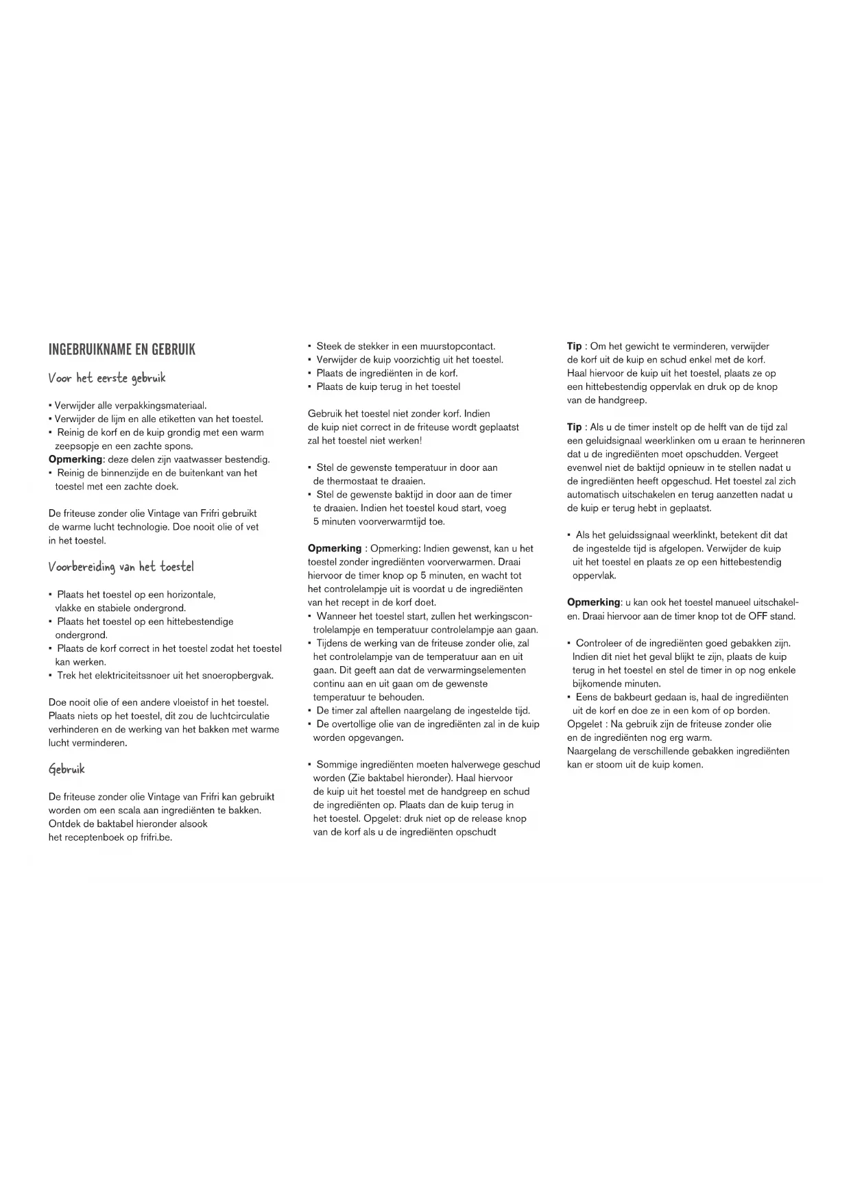 - Reinig de binnenzijde en de buitenkant van het toestel met een zachte doek. De friteuse zonder olie Vintage van Frifri gebruikt de warme lucht technologie. Doe nooit olie of vet in het toestel. Voorbereiding van het toestel