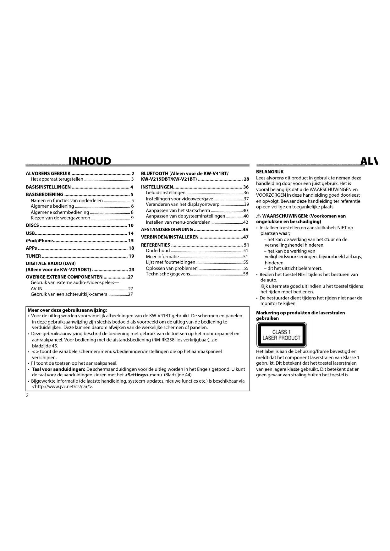 - De bestuurder dient tijdens het rijden niet naar de monitor te kijken. Markering op produkten die laserstralen gebruiken Het label is aan de behuizing/frame bevestigd en meldt dat het component laserstralen van Klasse 1 gebruikt. Dit betekent dat het toestel laserstralen van een lagere klasse gebruikt. Dit betekent dat er geen gevaar van straling buiten het toestel is. KW-V_Entry_E_NL.indb 2KW-V_Entry_E_NL.indb 2 25/9/2014 3:26:49 PM25/9/2014 3:26:49 PMNEDERLANDS 3 Informatie over het weggooien van gebruikte elektrische en elektronische apparatuur en batterijen (voor landen die gescheiden vuilverwerkingssystemen gebruiken) Producten en batterijen met dit symbool (doorkruiste vuilnisbak) kunnen niet als gewoon huisvuil worden weggegooid. Oude elektrische en elektronische apparaten en batterijen moeten worden gerecycled door een hiervoor geschikte faciliteit. Raadpleeg de lokale betreffende instantie voor details aangaande een geschikte recycle-faciliteit in uw buurt. Het juist recyclen en weggooien van vuil helpt bronnen te besparen en vermindert een schadelijke invloed op uw gezondheid en het milieu. Opmerking: De “Pb”-markering onder het symbool voor batterijen geeft aan dat de batterij lood bevat. Voor de KW-V11 Conformiteitsverklaring met betrekking tot de EMC-richtlijn van de Europese Unie (2004/108/EC) Conformiteitsverklaring met betrekking tot de RoHS-richtlijn van de Europese Unie (2011/65/EU) Fabrikant: JVC KENWOOD Corporation 3-12 Moriya-cho, Kanagawa-ku, Yokohama-shi, Kanagawa, 221-0022, Japan EU-vertegenwoordiger: JVC Technical Services Europe GmbH Konrad-Adenauer-Allee 1-11, D-61118 Bad Vilbel, Germany V Voorzorgen voor de monitor: