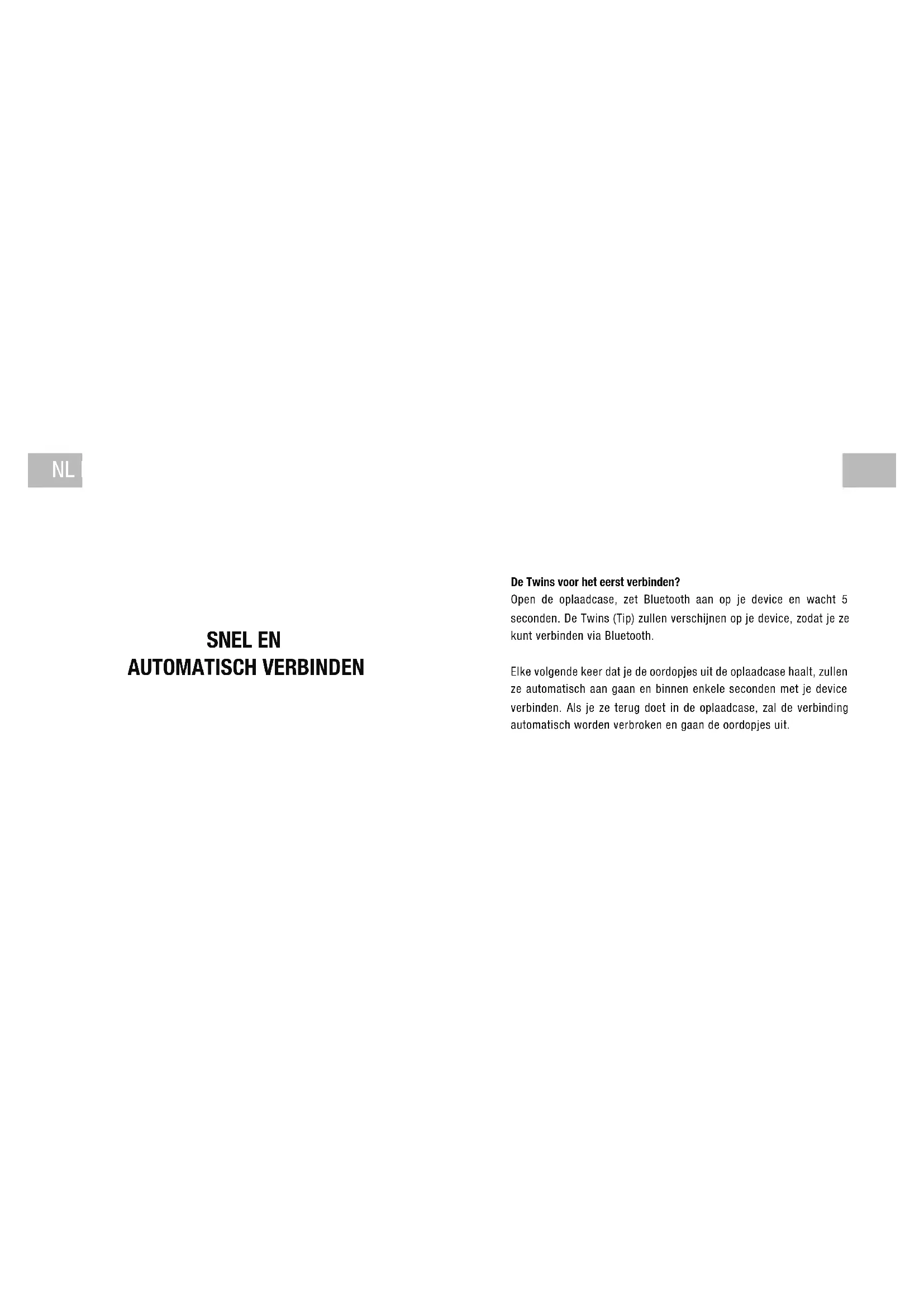 EN ENDe Twins voor het eerst verbinden? Open de oplaadcase, zet Bluetooth aan op je device en wacht 5 seconden. De Twins (Tip) zullen verschijnen op je device, zodat je ze kunt verbinden via Bluetooth. Elke volgende keer dat je de oordopjes uit de oplaadcase haalt, zullen ze automatisch aan gaan en binnen enkele seconden met je device verbinden. Als je ze terug doet in de oplaadcase, zal de verbinding automatisch worden verbroken en gaan de oordopjes uit. SNEL EN AUTOMATISCH VERBINDEN NL NLSpraakassistent Vorige nummer Volgende nummer Play/pauze
