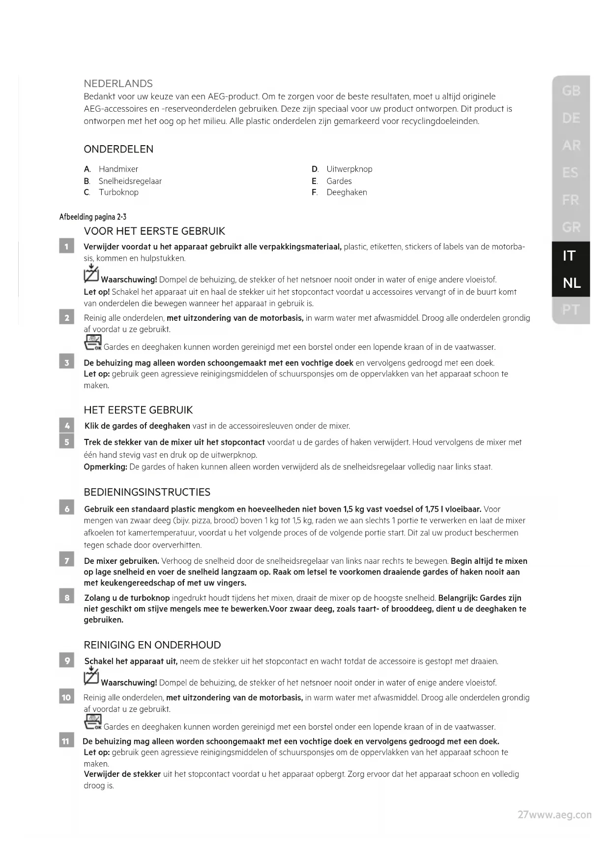 NEDERLANDS Bedankt voor uw keuze van een AEG-product. Om te zorgen voor de beste resultaten, moet u altijd originele AEG-accessoires en -reserveonderdelen gebruiken. Deze zijn speciaal voor uw product ontworpen. Dit product is ontworpen met het oog op het milieu. Alle plastic onderdelen zijn gemarkeerd voor recyclingdoeleinden. ONDERDELEN A. Handmixer B. Snelheidsregelaar C. Turboknop D. Uitwerpknop E. Gardes F. Deeghaken Afbeelding pagina 2-3