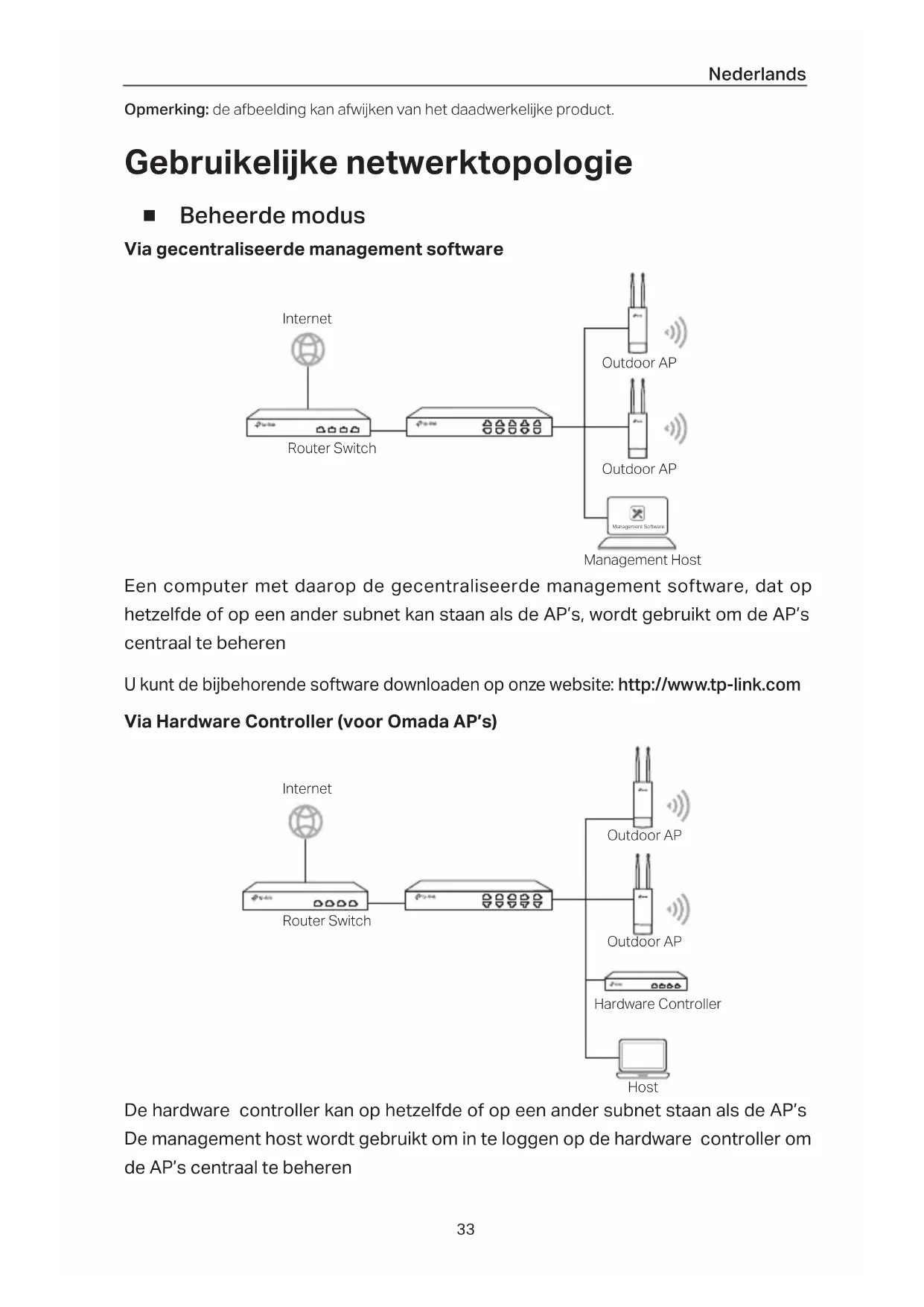 Opmerking: de afbeelding kan afwijken van het daadwerkelijke product. Gebruikelijke netwerktopologie ■ Beheerde modus Via gecentraliseerde management software Management Software Een computer met daarop de gecentraliseerde management software, dat op hetzelfde of op een ander subnet kan staan als de AP’s, wordt gebruikt om de AP’s centraal te beheren U kunt de bijbehorende software downloaden op onze website: http://www.tp-link.com Via Hardware Controller (voor Omada AP’s) De hardware controller kan op hetzelfde of op een ander subnet staan als de AP’s De management host wordt gebruikt om in te loggen op de hardware controller om de AP’s centraal te beheren Router Switch Internet Management Host Outdoor AP Outdoor AP Router Switch Internet Outdoor AP Outdoor AP Hardware Controller HostNederlands