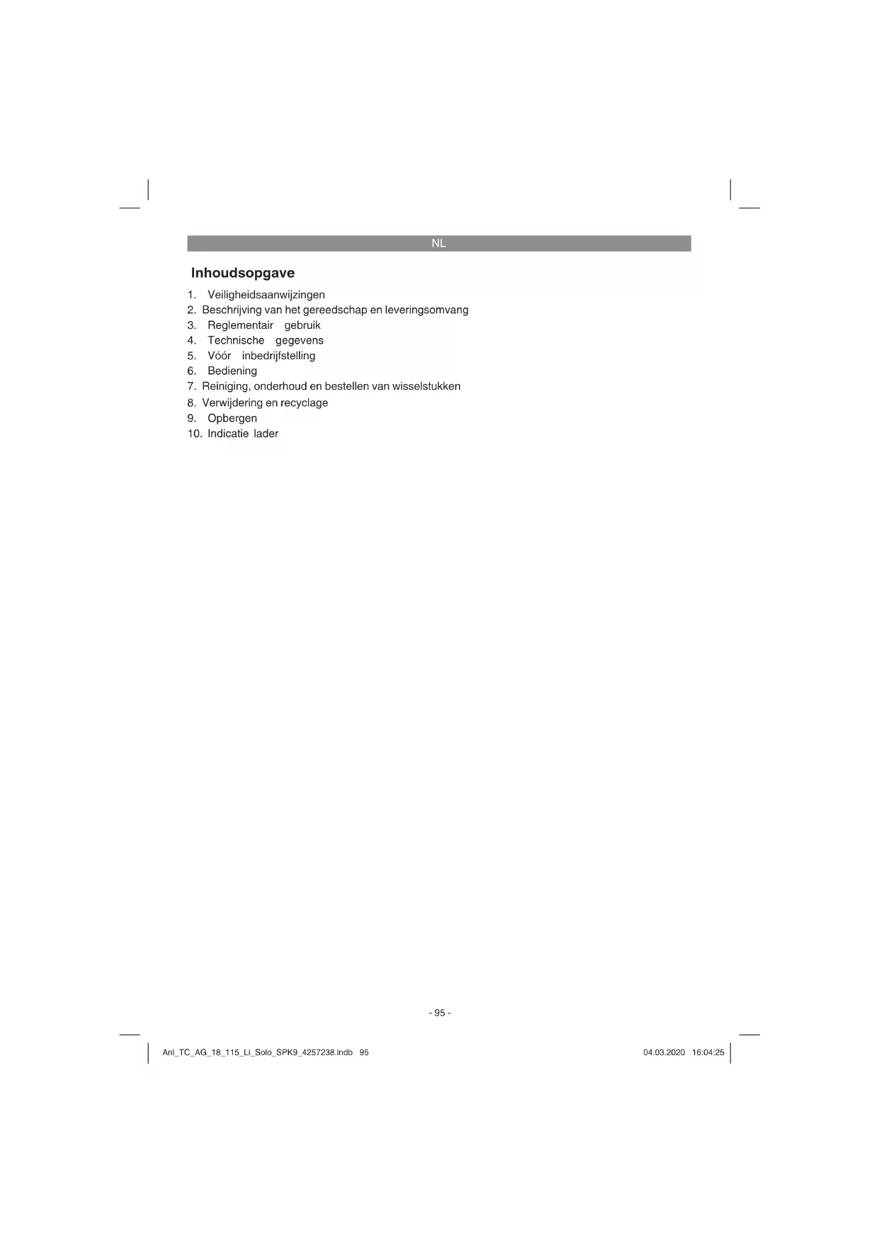 Enkel voor EU-landen Elektrisch gereedschap hoort niet bij het huisvuil thuis! Volgens de Europese richtlijn 2012/19/EG op afgedankte elektrische en elektronische toestellen en omzetting in nationaal recht dienen afgedankte elektrische gereedschappen afzonderlijk te worden ver- zameld en milieuvriendelijk te worden gerecycleerd. Recyclagealternatief i.p.v. het toestel terug te sturen: De eigenaar van het elektrische toestel is alternatief verplicht, i.p.v. het toestel terug te sturen, mede te werken bij de behoorlijke recyclage in geval hij zich van het eigendom ontdoet. Het afgedankte toestel kan hiervoor ook bij een verzamelplaats worden afgegeven die voor een verwijdering als bedoeld in de wetgeving in zake recyclage en afvalverwerking zorgt. Hieronder vallen niet bij de afgedankte toestellen gevoegde accessoires en hulpmiddelen zonder elektrische componenten. Nadruk of andere reproductie van documentatie en geleidepapieren van de producten, geheel of ge- deeltelijk, enkel toegestaan mits uitdrukkelijke toestemming van iSC GmbH. Technische wijzigingen voorbehouden Anl_TC_AG_18_115_Li_Solo_SPK9_4257238.indb 103Anl_TC_AG_18_115_Li_Solo_SPK9_4257238.indb 103 04.03.2020 16:04:2704.03.2020 16:04:27NL