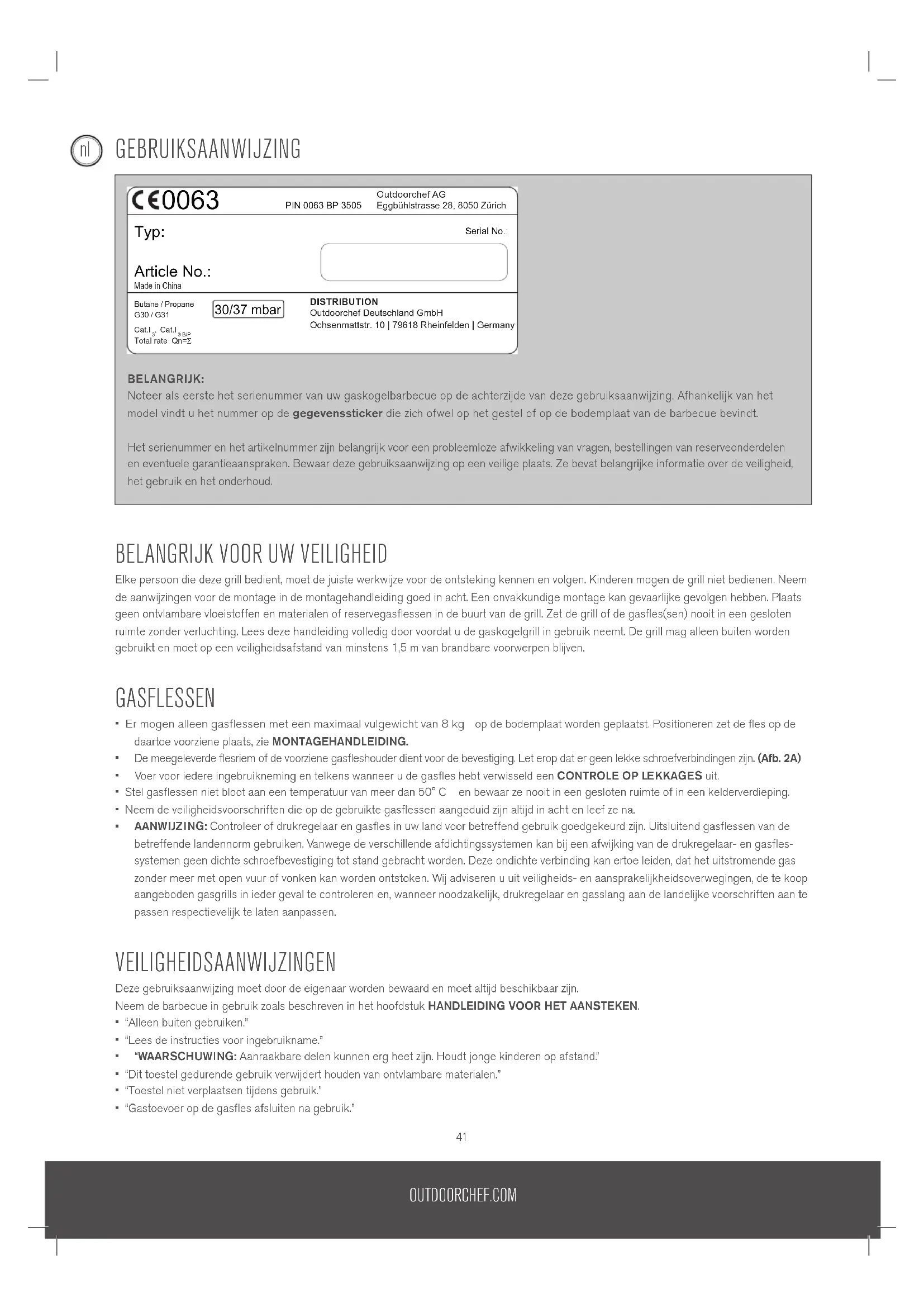 - Op onze website vindt u onder OUTDOORCHEF.COM een lijst van verdelers. ** Het serienummer en het artikelnummer kunt op de gegevenssticker van uw barbecue aflezen (zie hiervoor het eerste deel van deze GEBRUIKSAANWIJZING).OUTDOORCHEF.COM