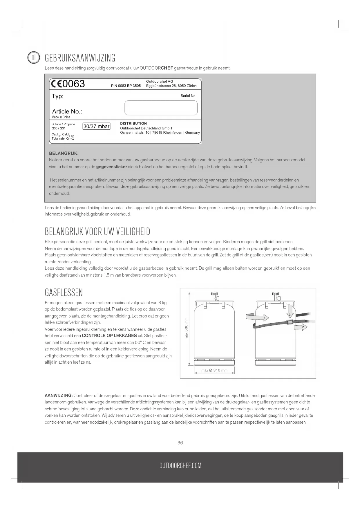BELANGRIJK: Noteer eerst en vooral het serienummer van uw gasbarbecue op de achterzijde van deze gebruiksaanwijzing. Volgens het barbecuemodel vindt u het nummer op de gegevensticker die zich ofwel op het barbecuegestel of op de bodemplaat bevindt. Het serienummer en het artikelnummer zijn belangrijk voor een probleemloze afhandeling van vragen, bestellingen van reserveonderdelen en eventuele garantieaanspraken. Bewaar deze gebruiksaanwijzing op een veilige plaats. Ze bevat belangrijke informatie over veiligheid, gebruik en onderhoud. Total rate Qn=Σ Typ: PIN 0063 BP 3505Outdoorchef AGEggbühlstrasse 28, 8050 Zürich