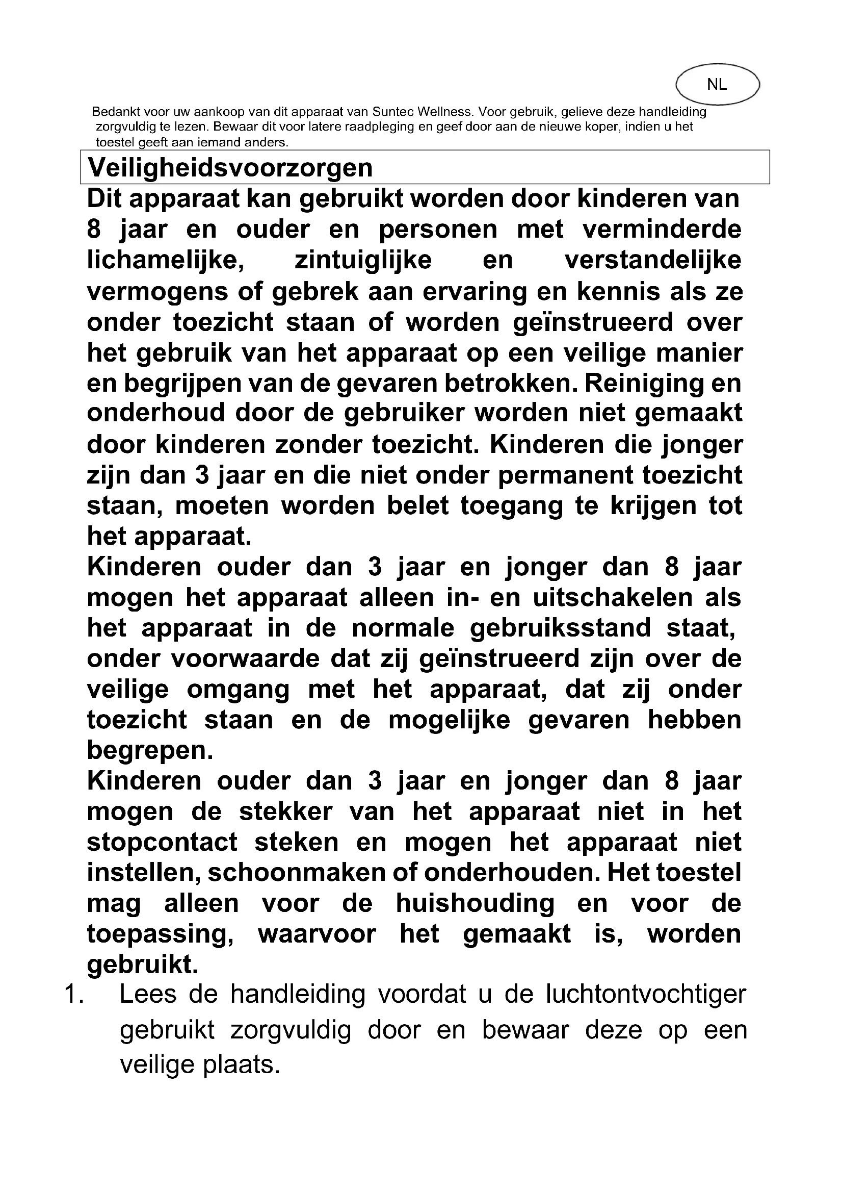 DryFix 30 select APP SUNTEC WELLNESS GMBH / HOLZSTRASSE 2 / 40221 DÜSSELDORF / GERMANIABedankt voor uw aankoop van dit apparaat van Suntec Wellness. Voor gebruik, gelieve deze handleiding zorgvuldig te lezen. Bewaar dit voor latere raadpleging en geef door aan de nieuwe koper, indien u het toestel geeft aan iemand anders. Dit apparaat kan gebruikt worden door kinderen van 8 jaar en ouder en personen met verminderde lichamelijke, zintuiglijke en verstandelijke vermogens of gebrek aan ervaring en kennis als ze onder toezicht staan of worden geïnstrueerd over het gebruik van het apparaat op een veilige manier en begrijpen van de gevaren betrokken. Reiniging en onderhoud door de gebruiker worden niet gemaakt door kinderen zonder toezicht. Kinderen die jonger zijn dan 3 jaar en die niet onder permanent toezicht staan, moeten worden belet toegang te krijgen tot het apparaat. Kinderen ouder dan 3 jaar en jonger dan 8 jaar mogen het apparaat alleen in- en uitschakelen als het apparaat in de normale gebruiksstand staat, onder voorwaarde dat zij geïnstrueerd zijn over de veilige omgang met het apparaat, dat zij onder toezicht staan en de mogelijke gevaren hebben begrepen. Kinderen ouder dan 3 jaar en jonger dan 8 jaar mogen de stekker van het apparaat niet in het stopcontact steken en mogen het apparaat niet instellen, schoonmaken of onderhouden. Het toestel mag alleen voor de huishouding en voor de toepassing, waarvoor het gemaakt is, worden gebruikt.