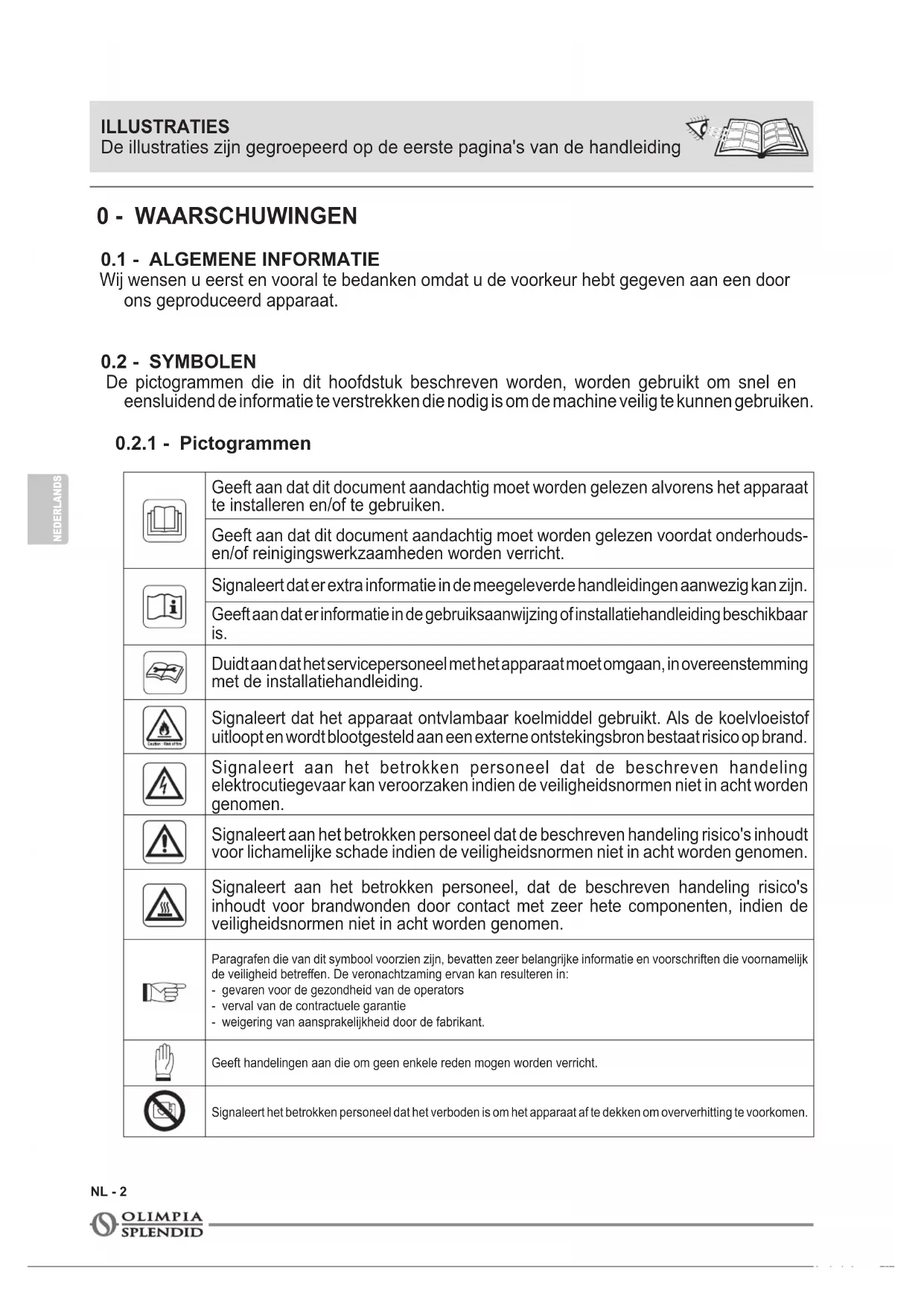 Geeft aan dat dit document aandachtig moet worden gelezen alvorens het apparaat te installeren en/of te gebruiken. Geeft aan dat dit document aandachtig moet worden gelezen voordat onderhouds- en/of reinigingswerkzaamheden worden verricht. Signaleert dat er extra informatie in de meegeleverde handleidingen aanwezig kan zijn. Geeft aan dat er informatie in de gebruiksaanwijzing of installatiehandleiding beschikbaar is. Duidt aan dat het servicepersoneel met het apparaat moet omgaan, in overeenstemming met de installatiehandleiding. Signaleert dat het apparaat ontvlambaar koelmiddel gebruikt. Als de koelvloeistof uitloopt en wordt blootgesteld aan een externe ontstekingsbron bestaat risico op brand. Signaleert aan het betrokken personeel dat de beschreven handeling elektrocutiegevaar kan veroorzaken indien de veiligheidsnormen niet in acht worden genomen. Signaleert aan het betrokken personeel dat de beschreven handeling risico's inhoudt voor lichamelijke schade indien de veiligheidsnormen niet in acht worden genomen. Signaleert aan het betrokken personeel, dat de beschreven handeling risico's inhoudt voor brandwonden door contact met zeer hete componenten, indien de veiligheidsnormen niet in acht worden genomen. Paragrafen die van dit symbool voorzien zijn, bevatten zeer belangrijke informatie en voorschriften die voornamelijk de veiligheid betreen. De veronachtzaming ervan kan resulteren in:- gevaren voor de gezondheid van de operators- verval van de contractuele garantie- weigering van aansprakelijkheid door de fabrikant.Geeft handelingen aan die om geen enkele reden mogen worden verricht.Signaleert het betrokken personeel dat het verboden is om het apparaat af te dekken om oververhitting te voorkomen. ILLUSTRATIES De illustraties zijn gegroepeerd op de eerste pagina's van de handleidingAQUARIA S1 10/12/14/16 P NL - 3 NEDERLANDS
