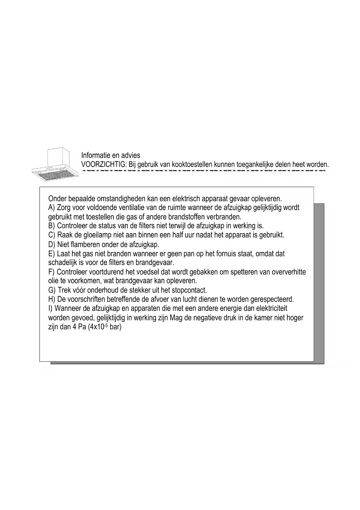 bar)J) Als het netsnoer beschadigd is, moet het worden vervangen door de fabrikant, diens servicevertegenwoordiger of vergelijkbaar gekwalificeerde personen om gevaar te voorkomen. K) Dit apparaat mag worden gebruikt door kinderen vanaf 8 jaar en door personen met verminderde lichamelijke, zintuiglijke of geestelijke vermogens of met een gebrek aan kennis en ervaring, mits zij onder toezicht worden gehouden of instructies hebben gekregen om het apparaat veilig te kunnen gebruiken en de gevaren begrijpen die ermee gepaard gaan. Kinderen mogen niet met het apparaat spelen. De reiniging en het reguliere onderhoud van het apparaat mogen niet worden uitgevoerd door kinderen, tenzij deze ouder zijn dan 8 jaar en tenzij er toezicht is. L) de afzuigkap is bedoeld voor installatie boven een fornuis met niet meer dan vier pitten. M) Uitsluitend voor huishoudelijk gebruik binnenshuis N) Wanneer het apparaat niet in gebruik is en voordat u het schoonmaakt, trekt u de stekker uit het stopcontact. O) Let op! Lees de waarschuwing op het instructieblad ten aanzien van de werking van het apparaat wanneer lucht uit de ruimte wordt afgevoerd P) Er is brandgevaar als de reiniging niet conform met de instructies wordt uitgevoerd. Informatie en advies VOORZICHTIG: Bij gebruik van kooktoestellen kunnen toegankelijke delen heet worden.Q) De lucht mag niet worden afgevoerd in een rookkanaal dat wordt gebruikt voor de afvoer van dampen van toestellen die gas of andere brandstoffen verbranden (niet van toepassing op apparaten die de lucht uitsluitend terug in de ruimte voeren).