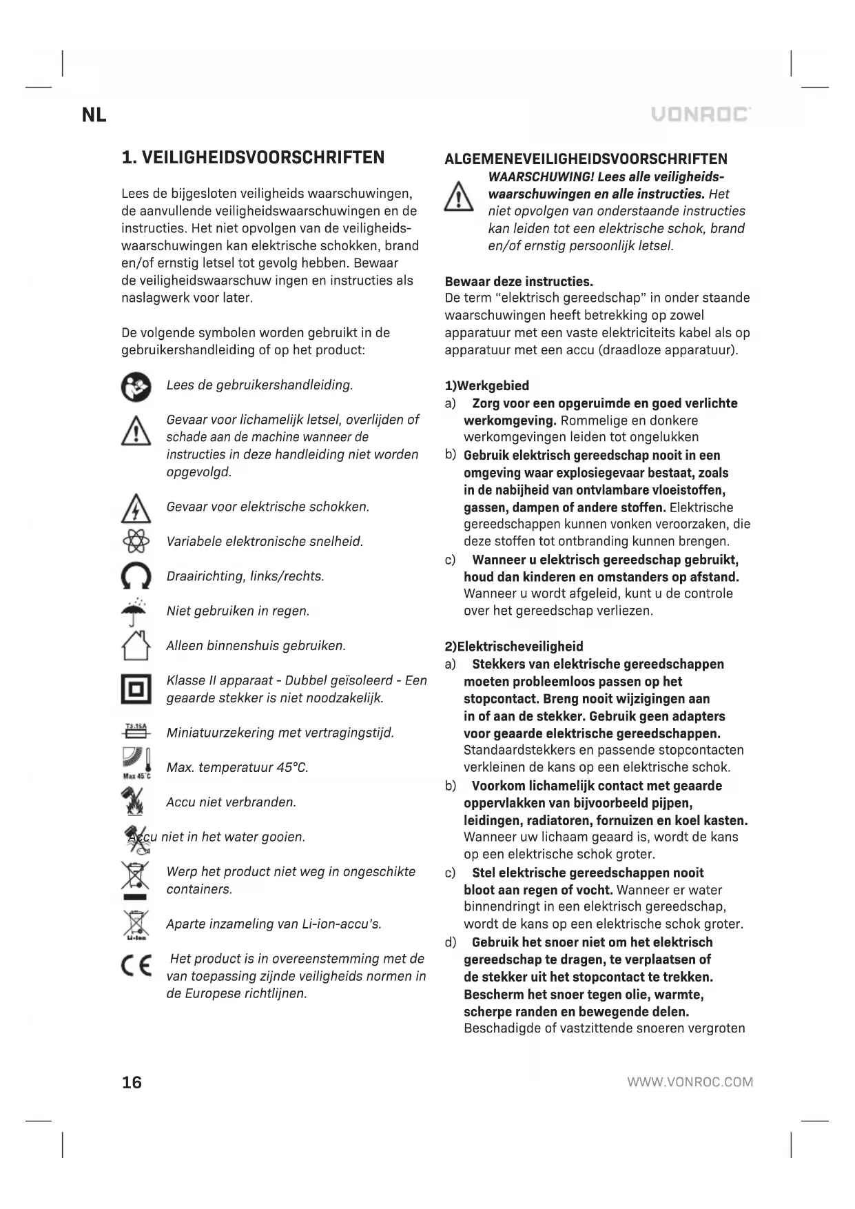 Schakel, voordat u met de reiniging en het onderhoud begint, altijd de machine uit en haal het accupack uit de machine. Reinig de machinebehuizing regelmatig met een zachte doek, bij voorkeur iedere keer na gebruik. Zorg dat de ventilatiesleuven vrij van stof en vuil zijn. Gebruik bij hardnekkig vuil een zachte doek bevochtigd met zeepwater. Gebruik geen oplosmid- delen als benzine, alcohol, ammonia, etc. Dergelij- ke stoffen beschadigen de kunststof onderdelen. MILIEU Defecte en/of afgedankte elektrische of elektronische gereedschappen dienen ter verwerking te worden aangeboden aan een daarvoor verantwoordelijke instantie. Uitsluitend voor EG-landen Werp elektrisch gereedschap niet weg bij het huisvuil. Conform de Europese Richtlijn 2012/19/ EG voor Afgedankte Elektrische en Elektronische Apparatuur en de implementatie ervan in nationaal recht moet niet langer te gebruiken elektrisch gereedschap gescheiden worden verzameld en op een milieuvriendelijke wijze worden verwerkt. GARANTIE VONROC producten zijn ontworpen volgens de hoogste kwaliteitsstandaarden en gegarandeerd vrij van defecten, zowel materieel als fabrieksfouten, tijdens de wettelijk vastgestelde garantieperiode vanaf de eerste aankoopdatum. Mocht het product tijdens deze periode gebreken vertonen veroorzaakt door defecte materialen en/of fabrieksfouten, neem dan rechtstreeks contact op met VONROC. De volgende situaties vallen niet onder de garantie: