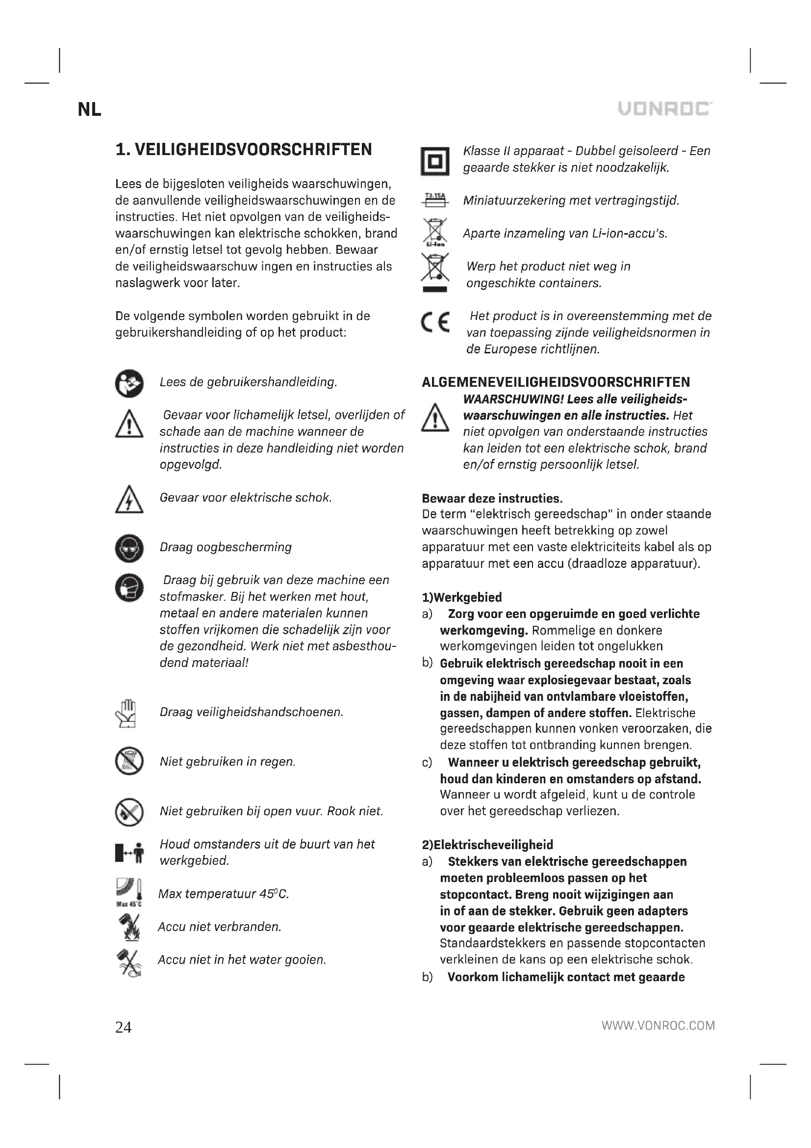 a) Open de accu niet. Er bestaat gevaar voor kort- sluiting. b) Bescherm de accu tegen hitte, bijvoorbeeld ook tegen voortdurend zonlicht, vuur, water en vocht. Er bestaat explosiegevaar. c) Bij beschadiging en onjuist gebruik van de accu kunnen er dampen vrijkomen. Zorg voor frisse lucht en raadpleeg bij klachten een arts. De dampen kunnen de lucht wegen irriteren. d) Gebruik de accu alleen in combinatie met uw Vonroc product. Alleen zo wordt de accu tegen gevaarlijke over belasting beschermd.