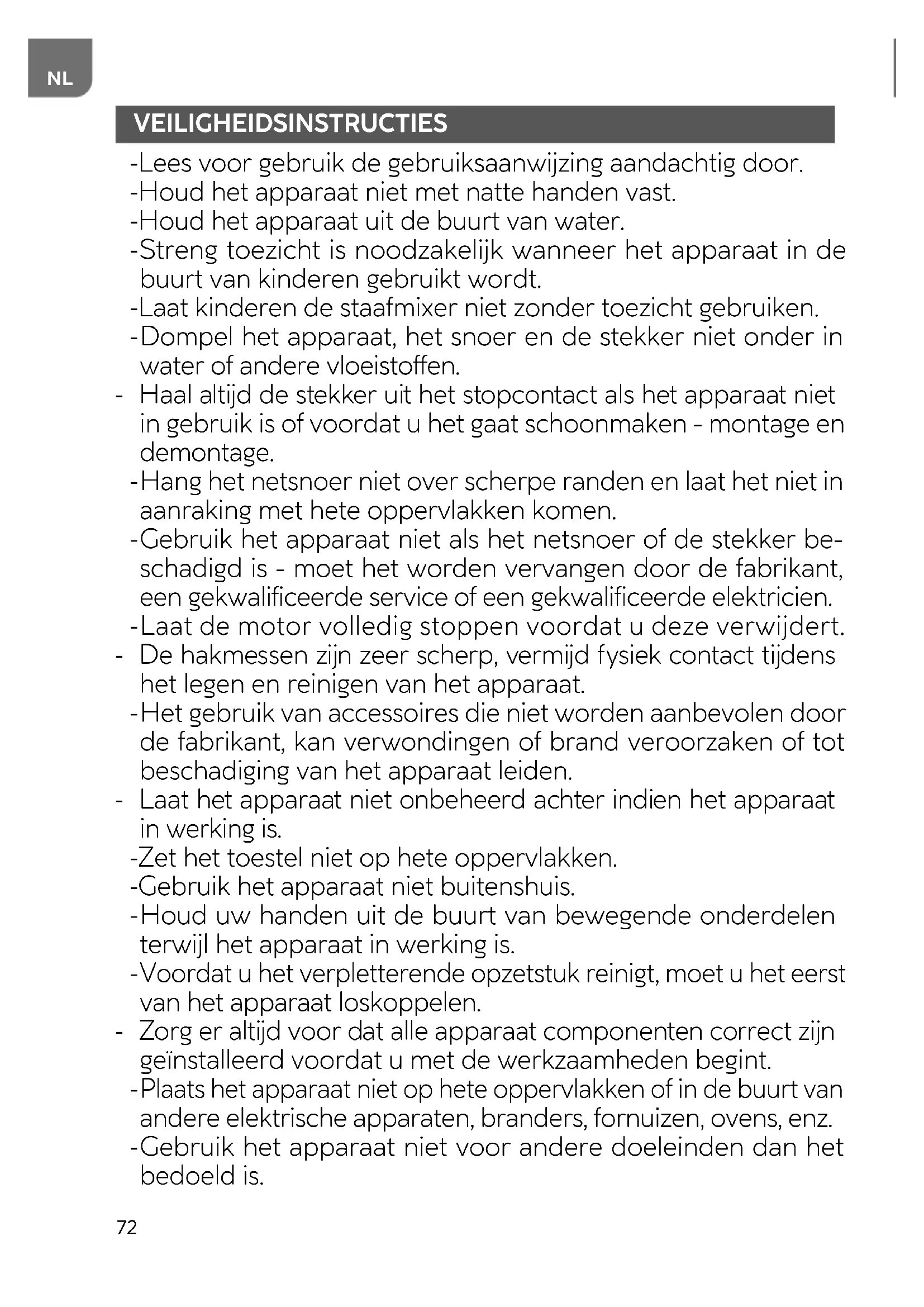 Streng toezicht is noodzakelijk wanneer het apparaat in de buurt van kinderen gebruikt wordt. - Laat kinderen de staafmixer niet zonder toezicht gebruiken.