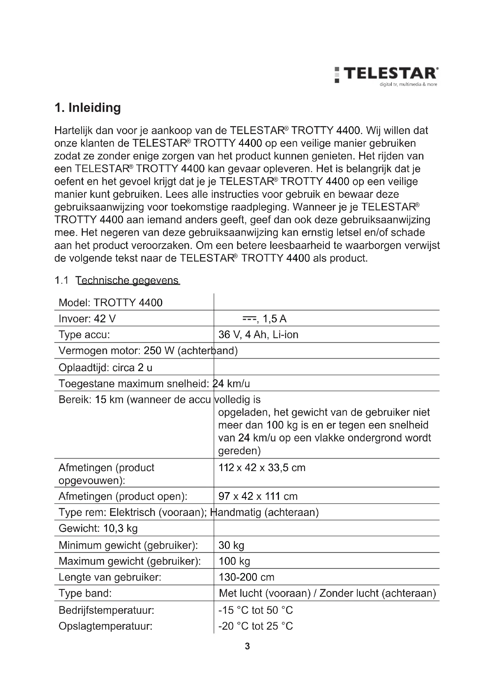 TROTTY 4400 aan iemand anders geeft, geef dan ook deze gebruiksaanwijzing mee. Het negeren van deze gebruiksaanwijzing kan ernstig letsel en/of schade aan het product veroorzaken. Om een betere leesbaarheid te waarborgen verwijst de volgende tekst naar de TELESTAR